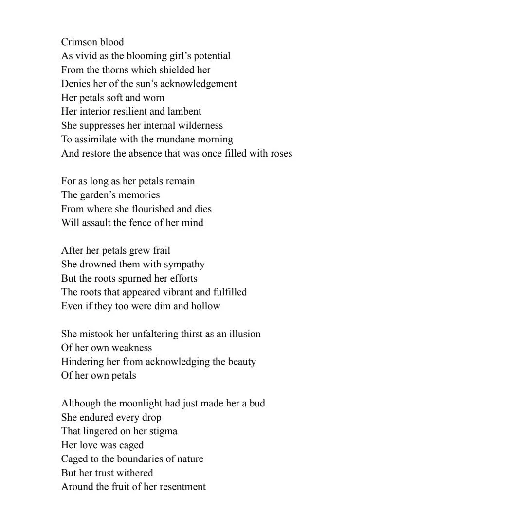 This poem illustrates an adolescent girl who is betrayed by a family member, symbolized by her roots which are inescapable. Throughout the poem, she attempts to restore the admiration she once had for that person and discovers that her efforts are unacknowledged. This poem captures the complexity of betrayal. Both the love and hate for the betrayer live simultaneously in the girl's heart. Ultimately, this conflict fosters resentment towards the betrayer.