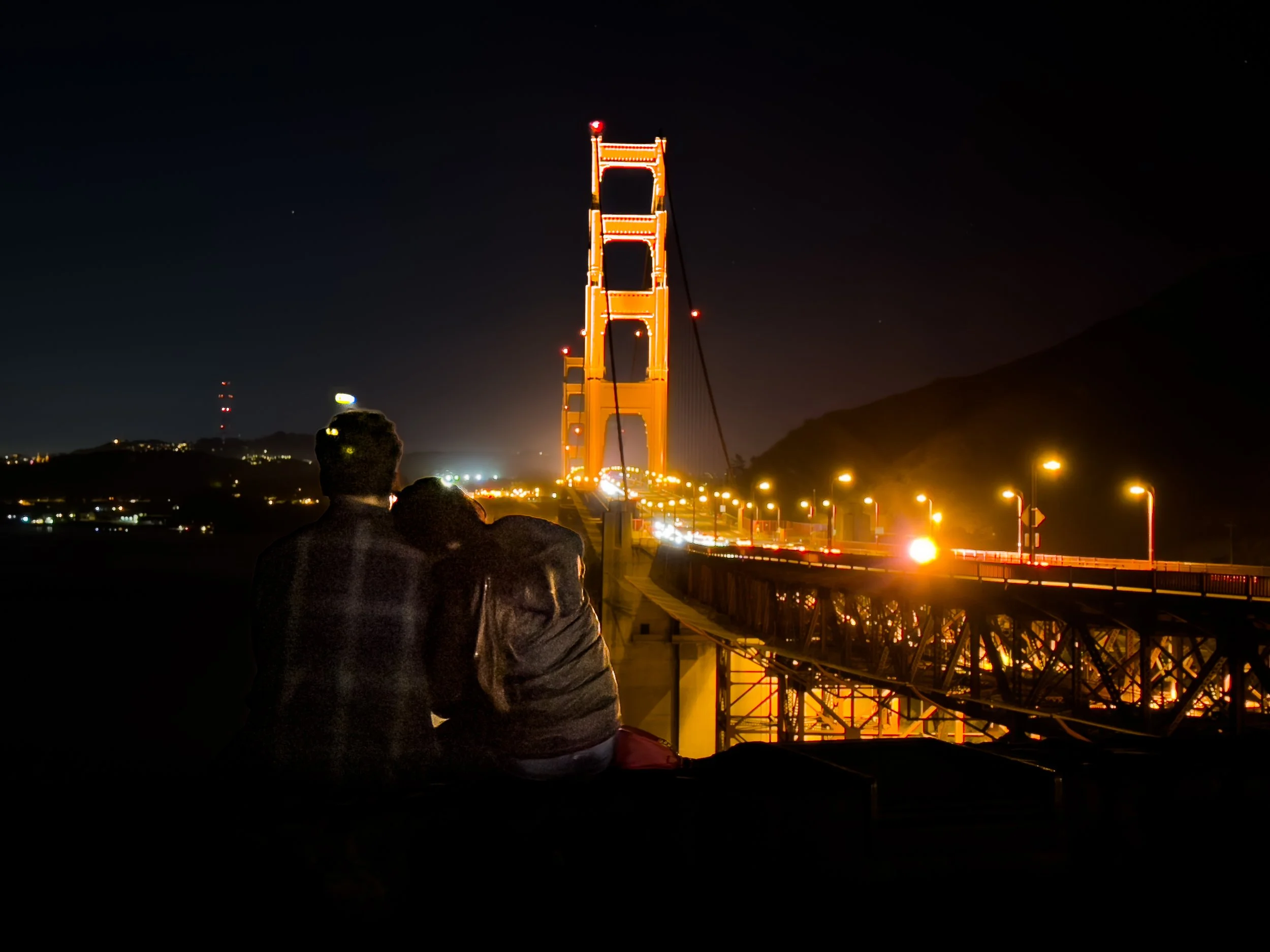 While stopped at Vista Point with my family, I was originally taking pictures of the Golden Gate Bridge itself, but then I saw a couple sitting on the wall, admiring the view. I thought it would make a great picture if I included them in the frame, so I positioned my phone camera to capture both the couple and the bridge. I took several pictures, trying to get the perfect one, and when she leaned on his shoulder, I knew I had to capture the moment. Afterward, I went up to them to let them know I had taken the pictures, showed them, and then sent them to the lovely couple.