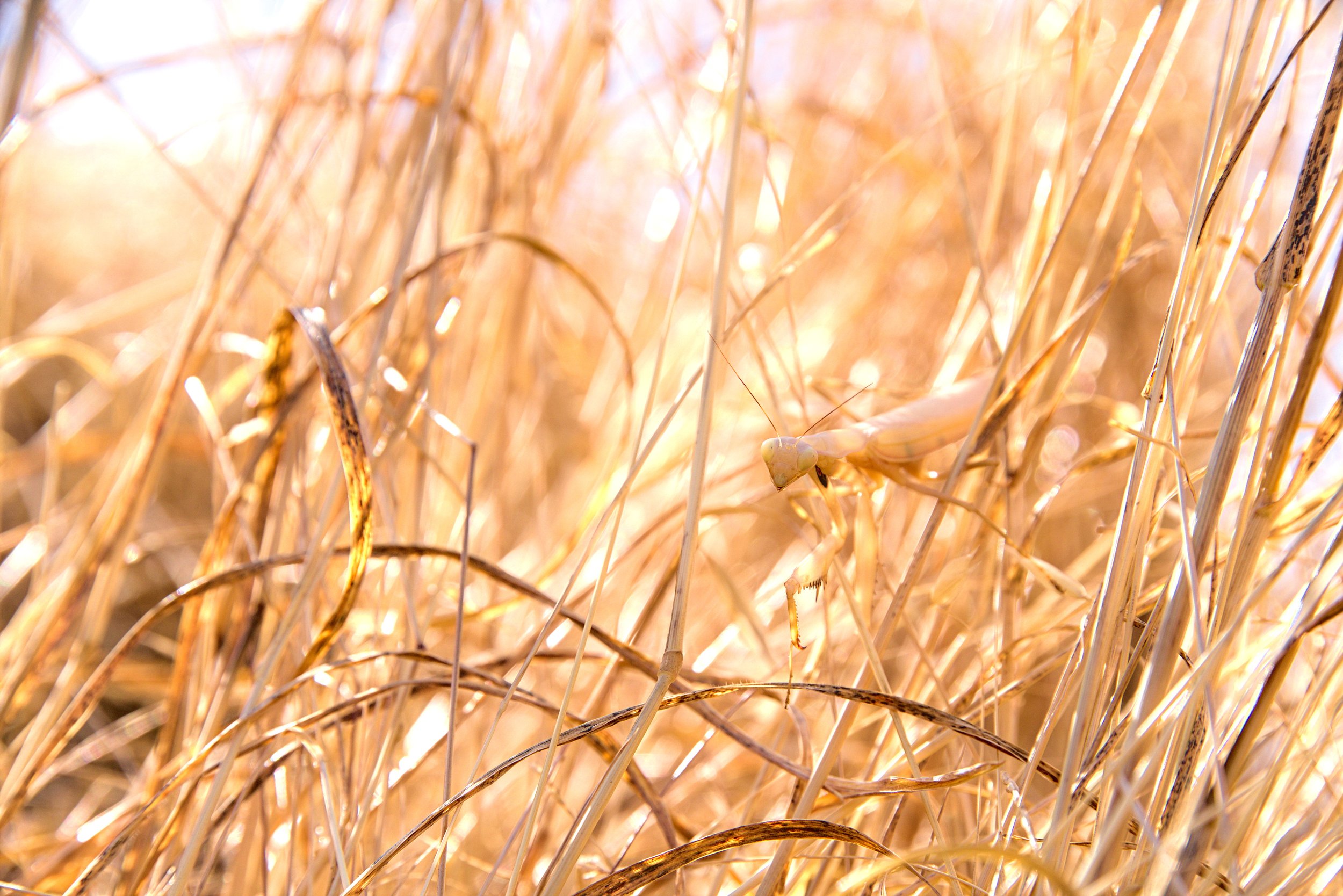 Getting down (or up) to perspective of an animal is so essential to capture an intimate shot of it. Here with this mantis I wanted to capture the beauty of its camouflage in the golden grass, with the golden afternoon sun filtering through. But to get a quality composition while fulfilling that goal required getting down to its level.