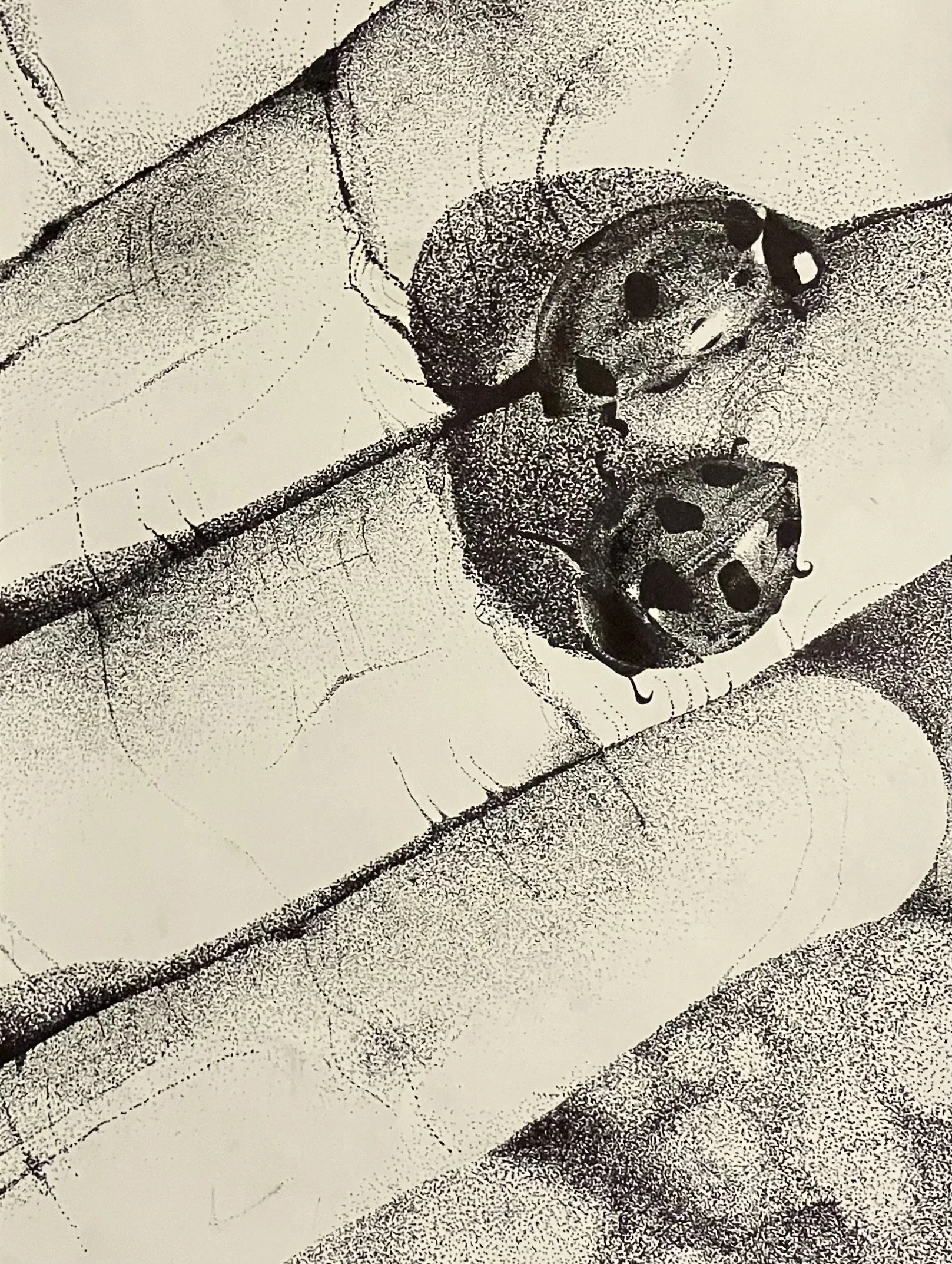 This piece was done by stippling with various micron pens. The piece depicts a photo of two ladybugs on my hand. As a person who is decently superstitious, I enjoy finding signs of good luck in nature. Ladybugs are one of my favorite insects and one of my favorite good luck indicators. I wanted to depict my care for nature, especially regarding the little bugs that often get ignored. I’m don’t remember exactly how long it took but it was definitely one of my longest pieces.