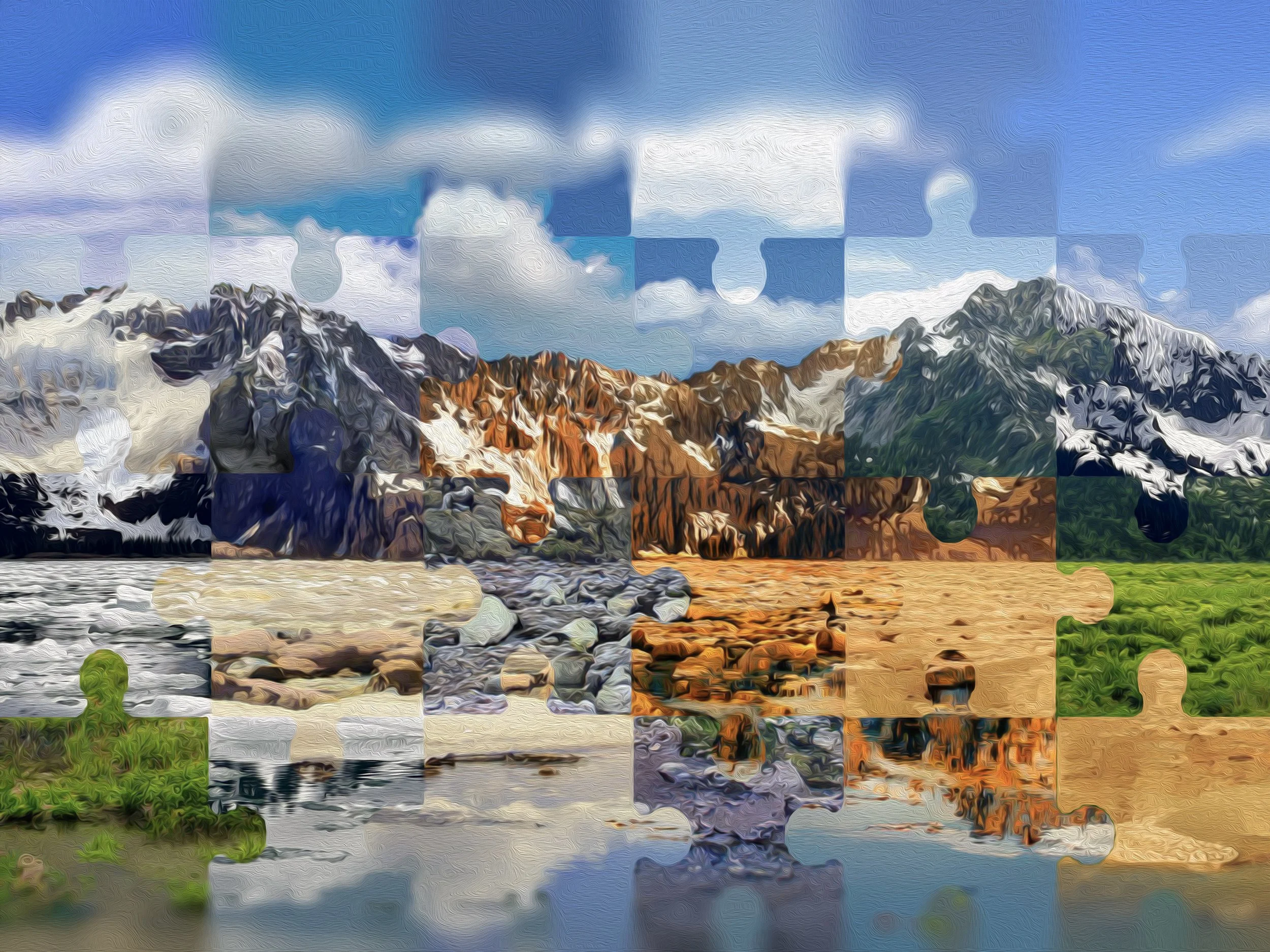 This digital artwork is based on a photograph I took while kayaking in Kenai Fjords, Alaska. I wanted to highlight the cohesion and harmony of nature by depicting one continuous mountain range in multiple seasons at once. As a child, I used to love solving puzzles, putting various pieces together to create one coherent larger image. When designing my piece, I utilized a jigsaw-puzzle motif, and fragmented the landscape into various environments contained within each puzzle piece, highlighting how all contrasting elements of nature work together forming one intertwined whole. I invite the viewers to draw their own meanings from this. Whether that's how humans are all interconnected, the diverse animal chain in an ecosystem, or anything else. While taking in this piece, I encourage viewers to reflect on what harmony looks like in their own life.