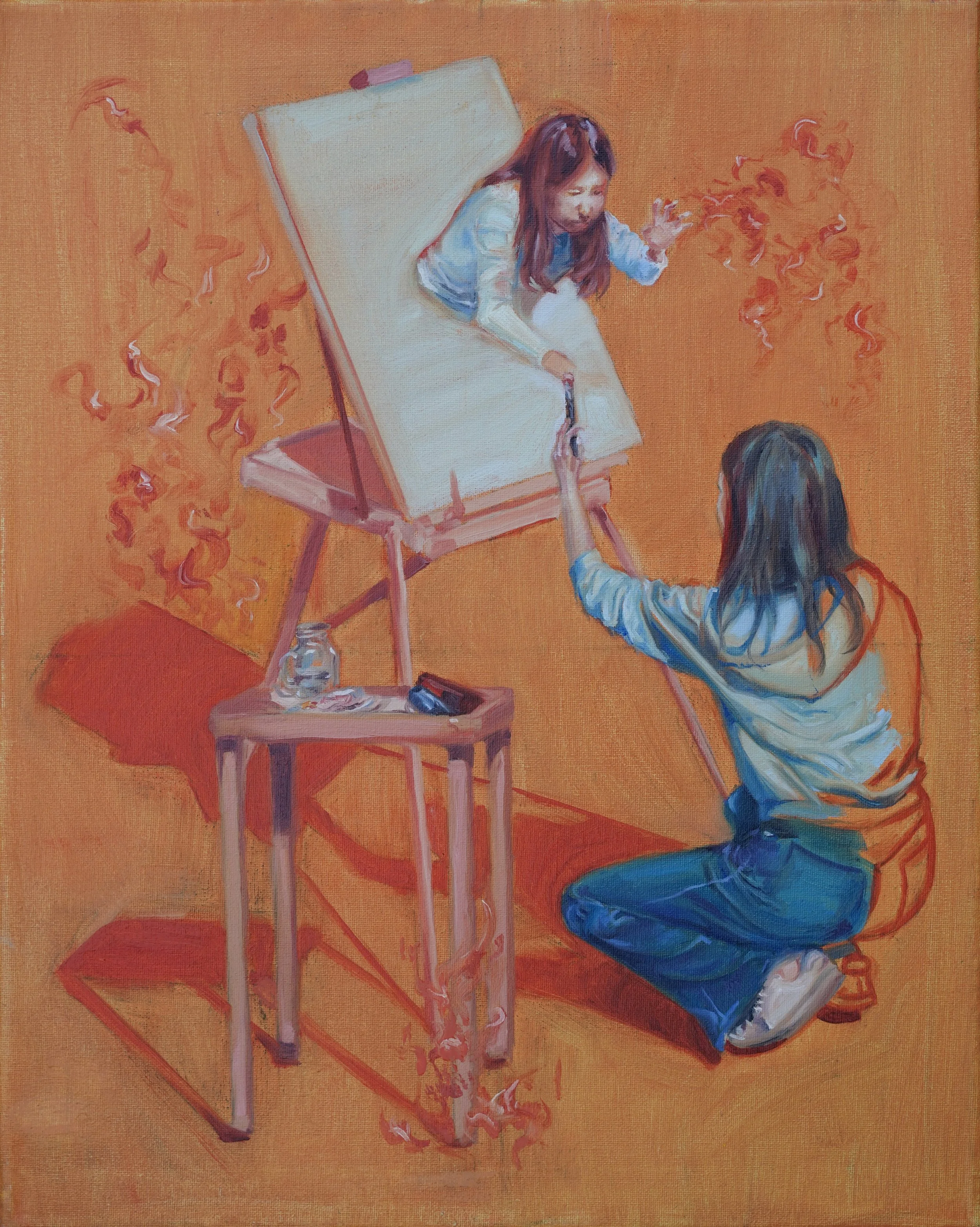 In "Hello, World," I leave the version of myself who holds the paintbrush unfinished. Some aspects of my identity remain uncertain to me, and creating self-portraits leads me toward clarity.