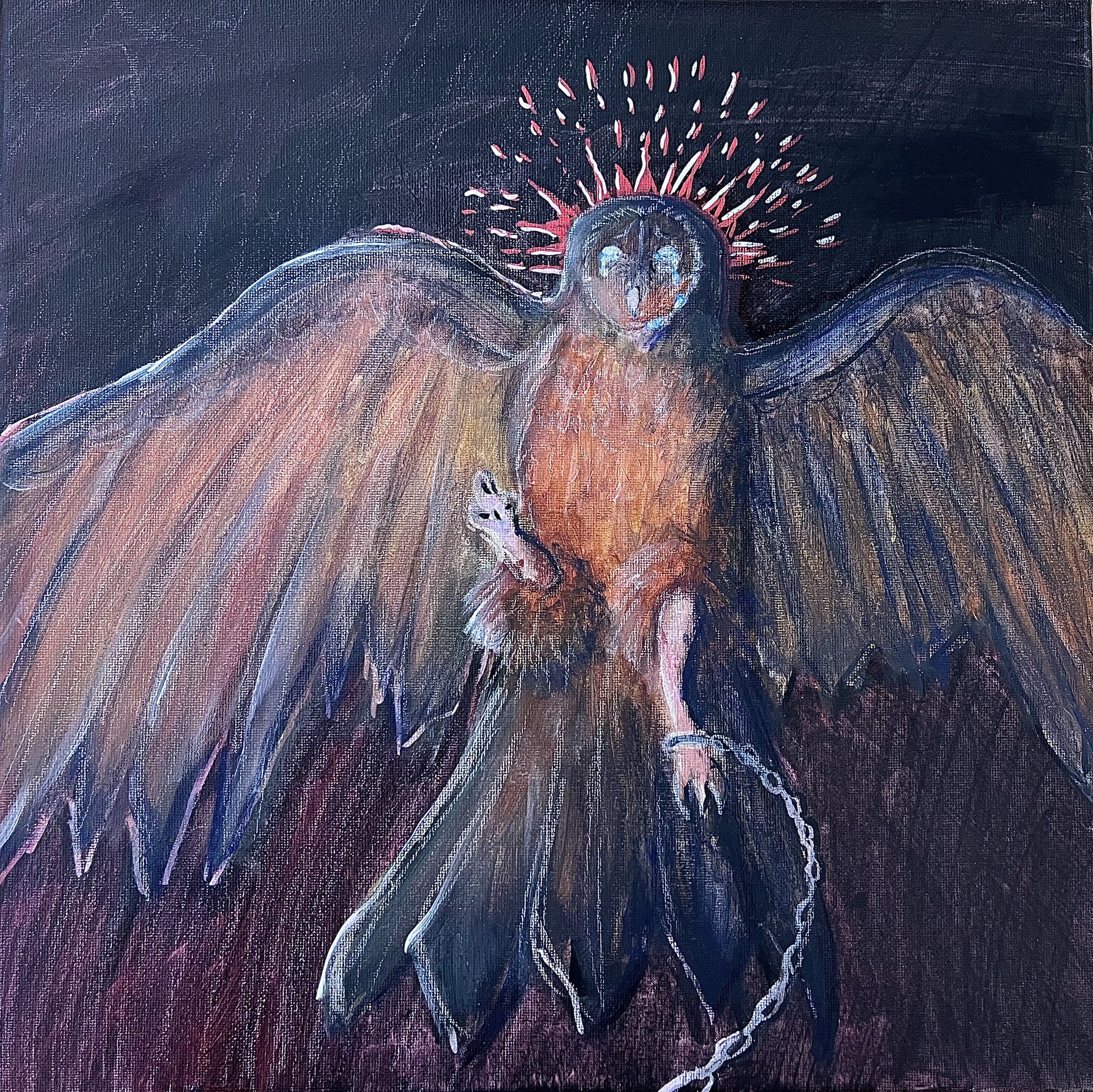 It represents feeling entrapped with no where to go to feel safe. Outside feels dangerous, but home doesn’t feel any safer. Tension is shown around the owl’s head, showing constant stress. Its wings are free to fly but it can’t go anywhere while chained down. The owl is in a vulnerable position, crying in not sadness, but fear.