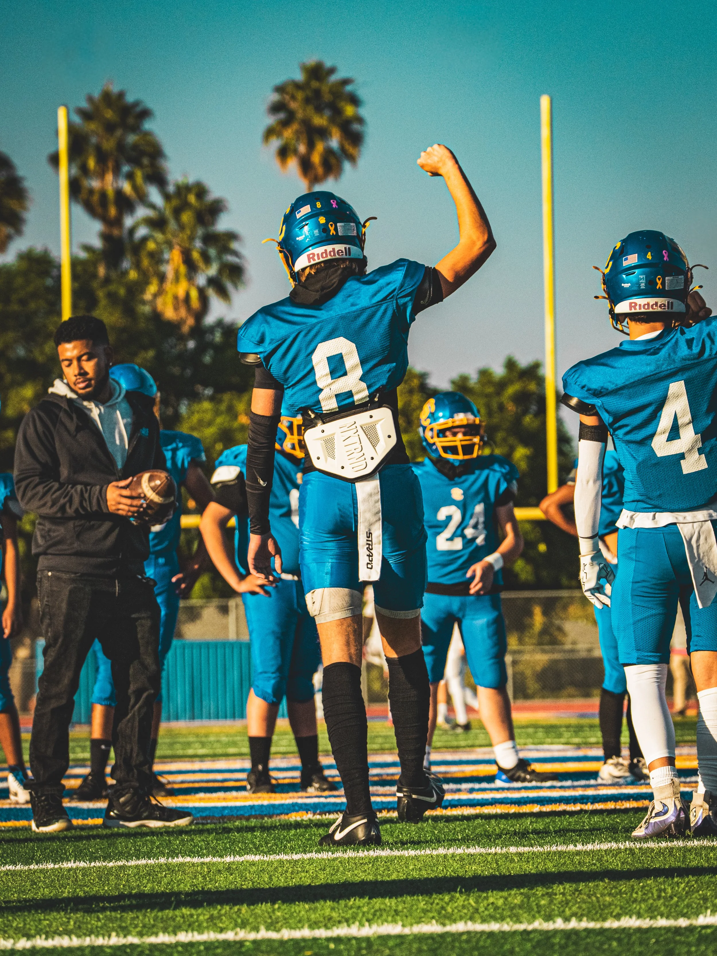 This picture is a vibrant, cinematic shot of a football team under the warm California sun. A player raises his fist in confidence as teammates and coaches gather around. The palm trees in the back giving off a Hollywood vibe. My process of taking and editing this photo was trying to show the emotions that happen at a football game and how people have to step up as leaders.