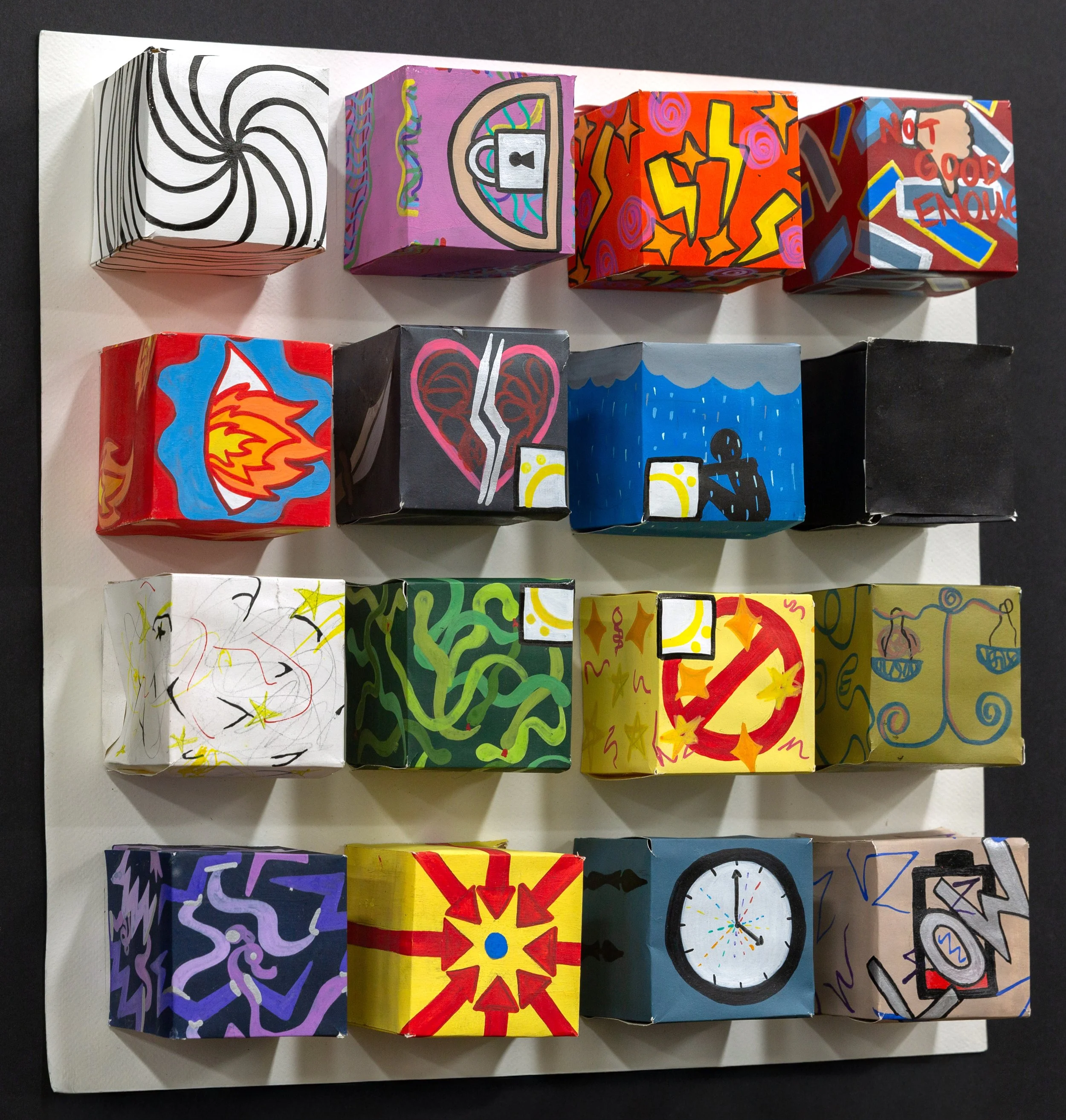 Even when you are surrounded by negative emotions, deep down everyone has a light in them that will help them combat negativity and give them hope. The hope will help them succeed even when they have a lot of struggles and emotions. Each box represents a negative emotion and the four in the middle make out the light that brings hope.