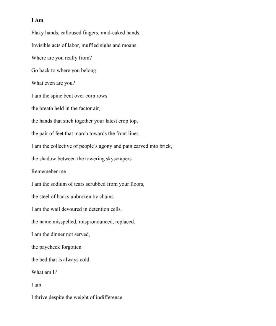Inspired by my interest in social justice and advocacy, especially topics such as immigration, I wrote this poem to express my frustration with people's attitudes toward immigrants.
