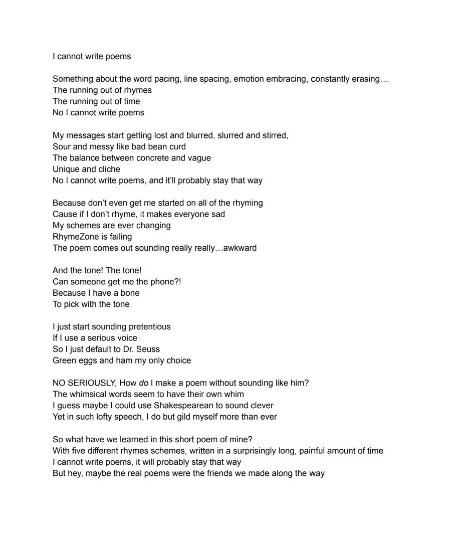 Poetry has always been a constant in my life. Whether it was reading my first fairy tales as a child, reading other teens' poems as a middle schooler for comfort, or tackling poems in foreign languages in high school, it has always fascinated me. However, poetry, unlike other forms of writing, has personally gotten harder for me to write over the years; something about laying out words in an original and vulnerable way, while simultaneously staying concise, challenges and intimidates me. I initially created this poem just for fun, as a comedic jab towards my struggles in poetry. However, nowadays it reminds me to stay motivated and keep writing, even when I’m writing pieces I think are irredeemable. This poem reminds me that it’s ok to write silly and bad stuff sometimes; not everything I make will be good, but as long as I keep practicing, I will eventually improve.