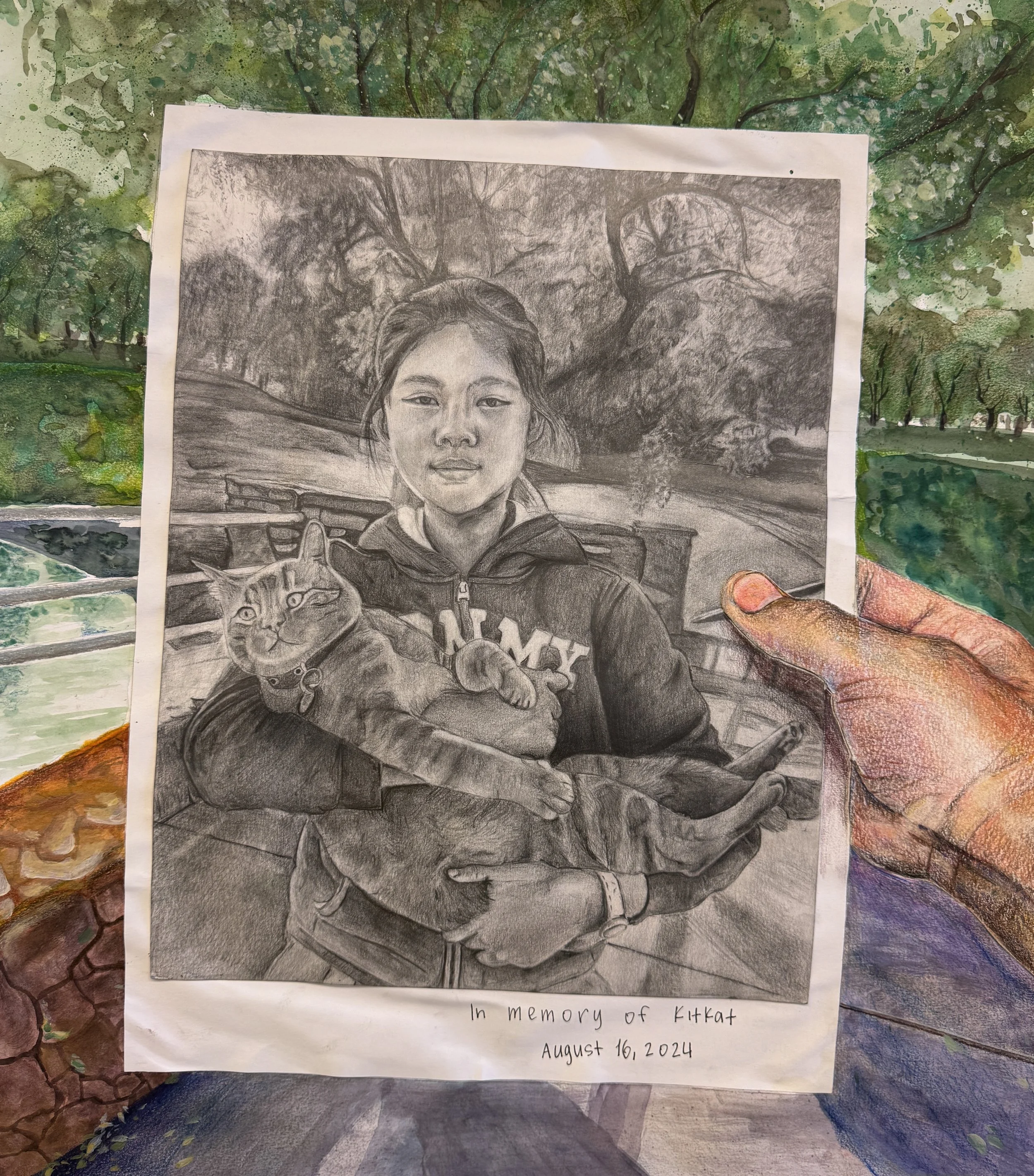 This piece I made is a drawing in memory of my cat, KitKat, who had passed away. It shows me holding an old photo I took back in 2024, where I held KitKat in my arms. The moment in the photo is more than just an old memory but also an important part of my life where I had another family member who gave me warmth and safety. In the drawing, I hold out the picture in the same exact spot where the photo was originally taken, showing the present-day scene. Although I am holding up the photo, it shows how I'm still holding onto the memory of the cat and me. This piece shows that although KitKat is now gone, he still holds a special place in my heart.