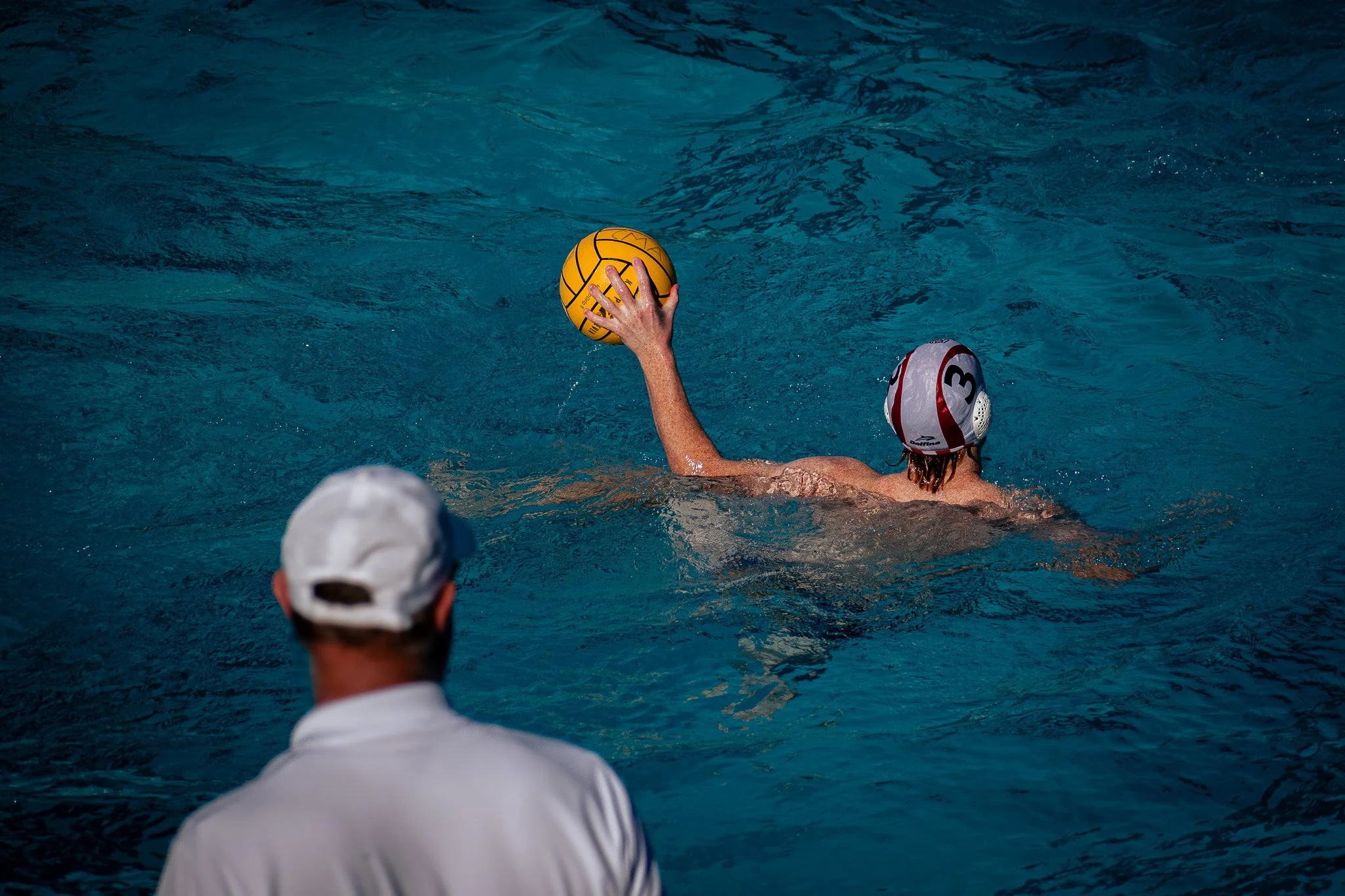 This image captures a moment of intense focus during a water polo game. The image has a good contrast between the stillness of the ref, just waiting and watching for a call that needs to be made, and the movement of the player getting ready to pass the ball. I wanted to connect the athlete's determination with the calm observation of the sidelines. I wanted to capture more than just what happens in the game, but also how the sidelines and even the fans affect the game. This photo does that. It has the ref just out of focus in the foreground, observing the play, and the main subject (the player) focused on his next move, determining how to make his next play.