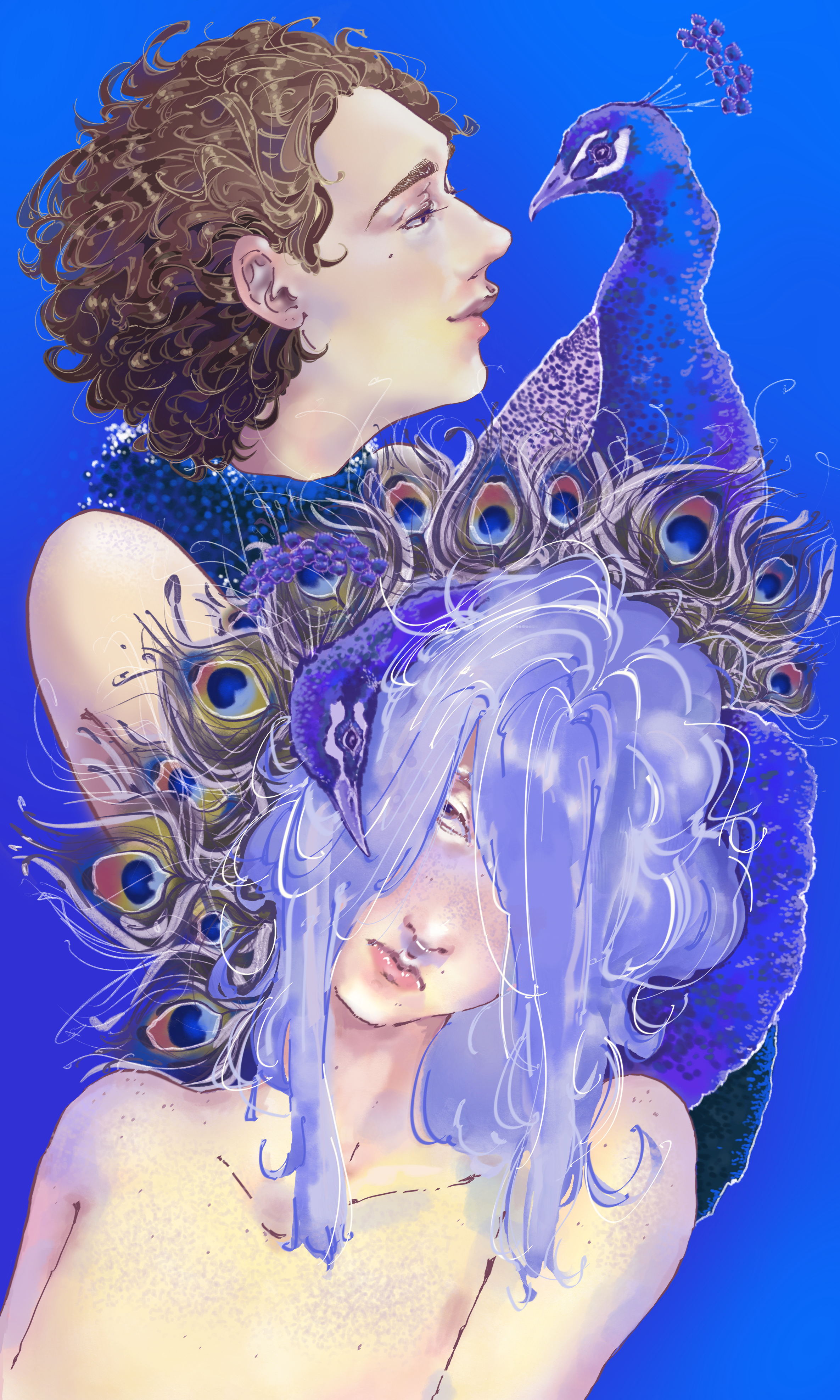 This piece captures a moment suspended in blue— Where feathers echo chaotic serenity in the form of vibrant hues and stillness.