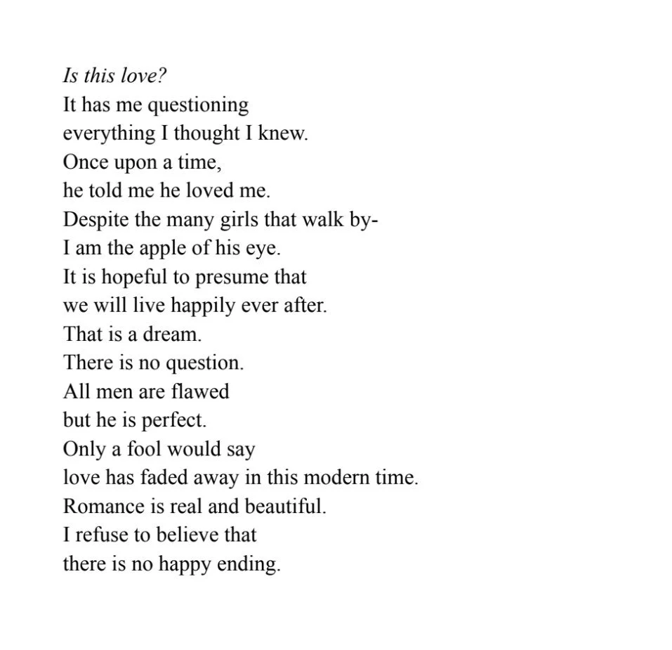 This poem is crafted as a palindrome, with the forward and backward readings representing the clash between the heart and brain’s interpretation of love. Inspired by the often idealized portrayal of love in the media, and the reality and complexity of it in the real world, this poem seeks to personify the turmoil that I, and many others, feel. The first half, read from top to bottom, captures the heart’s idealistic view. The second half, read from bottom to top, reflects the brain’s cynical and pragmatic perspective. By mirroring these two opposing forces, the poem highlights the internal conflict that often arises when love is both a dream and a challenge. Ultimately, it asks, “Is this love?” — a question I’m still trying to answer, like many of us.