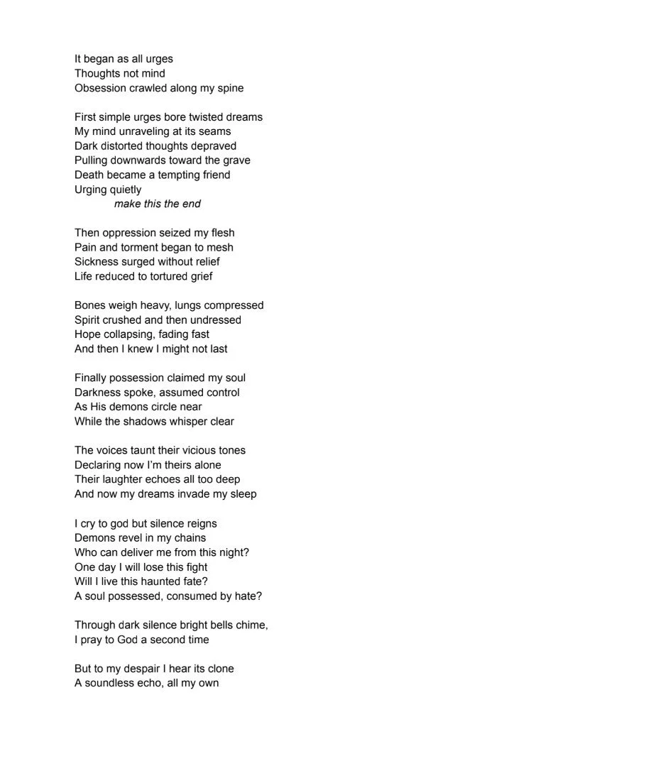 People often overlook depression because it isn’t a tangible thing they can see. This piece is meant to represent the fight against depression and despair as a physical battle, because I feel that having dark thoughts is one of the most consuming and life-altering burdens there is.