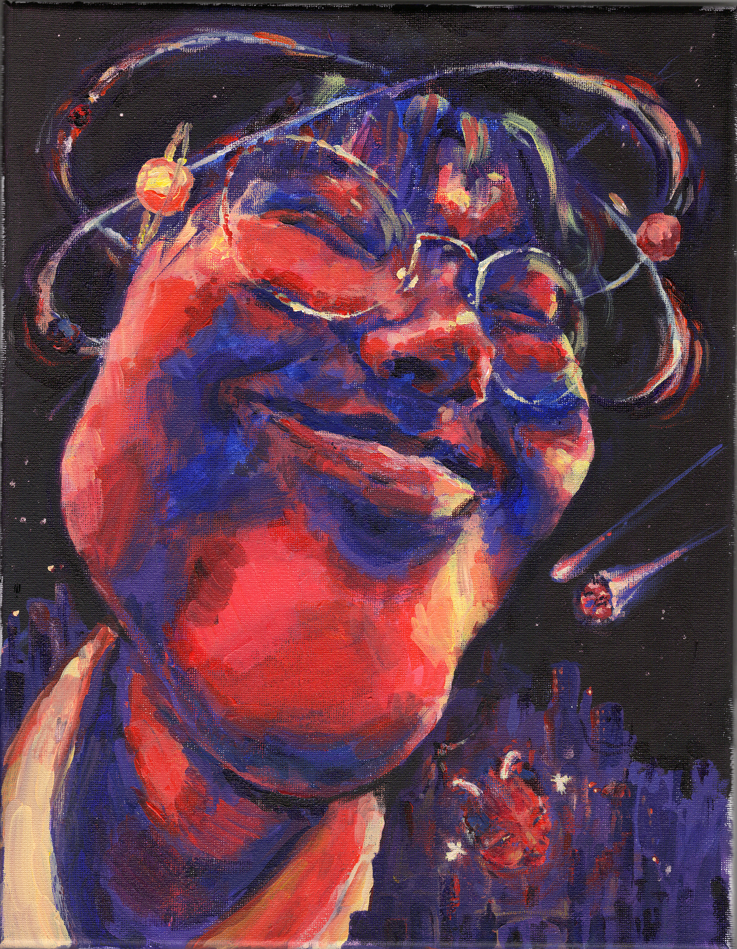 My painting is how I feel about my friends’ importance. I put my friends above the world. The person that is depicted in my painting is my friend, Ivy. If Ivy were to die then all of the civilizations and buildings on her would collapse. The planets are revolving around her because if Ivy were to disappear then all of the planets will go out of orbit, so my friends keep everything together. Ivy is also everywhere like in the sky and amongst the buildings because my friends are everywhere.