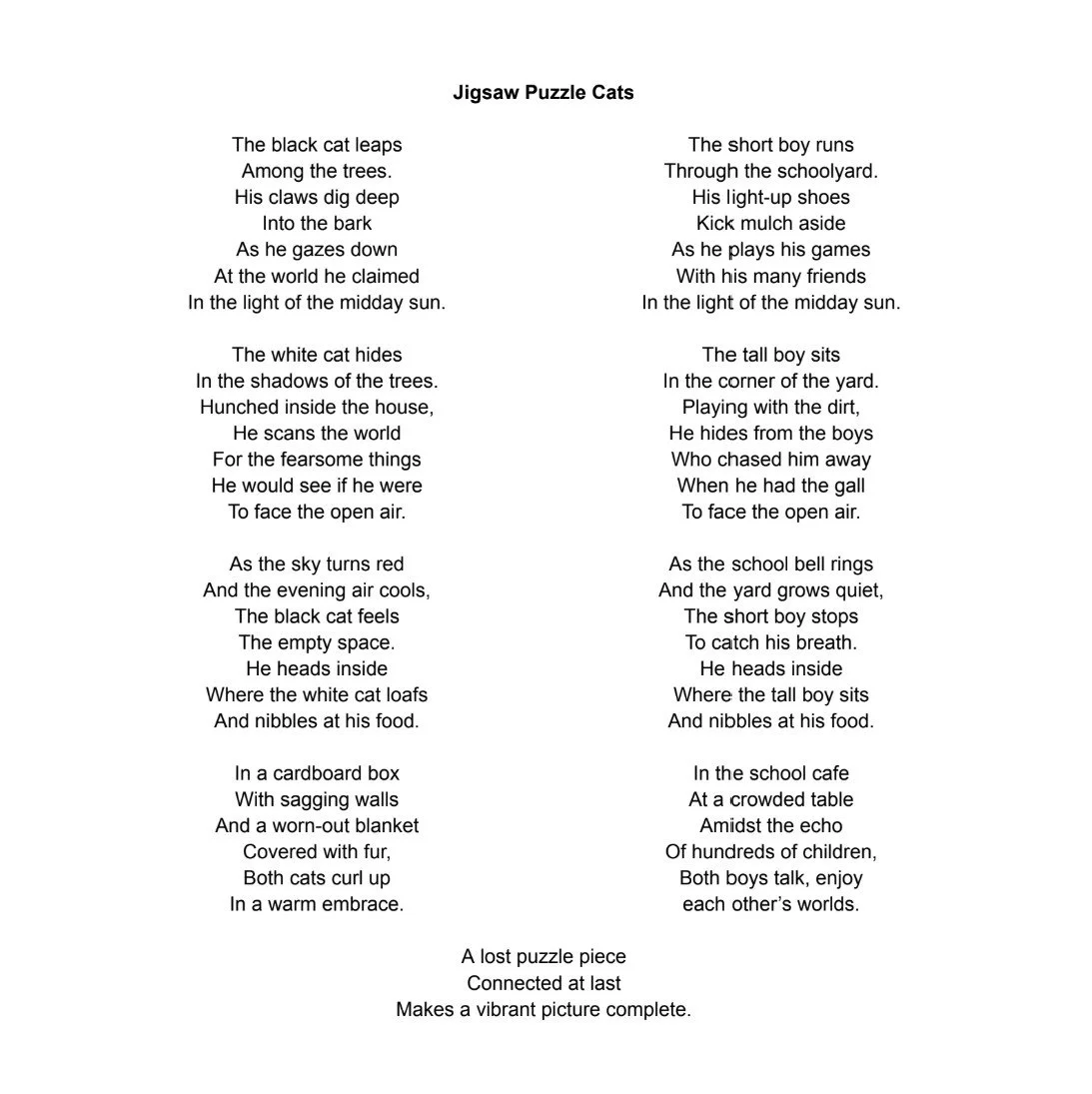 The cats described in the left column are based on my own. Watching my cats play made me think of my own childhood, which I described in the column on the right. As a shy, autistic boy who the other kids liked to pick on, I often sat by myself during recess, digging with sticks and pretending not to care that I was alone. I am eternally grateful for the few classmates of mine who saw right through it and invited me to play. The comparison of the cats to children on a playground invokes a sense of innocence which supports the poem’s happy ending and the message that simple acts of inclusion and kindness can change lives.