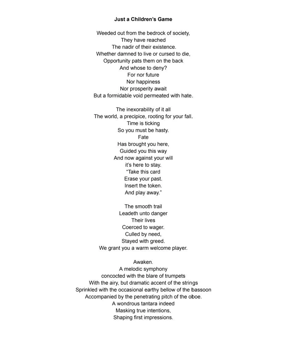 In writing my poem, I took inspiration from the popular television series, Squid Game. Its underlying theme about the consequences of a capitalist society, where rich tycoons overpower and exploit the lower class, was a point of focus going into writing my poem.