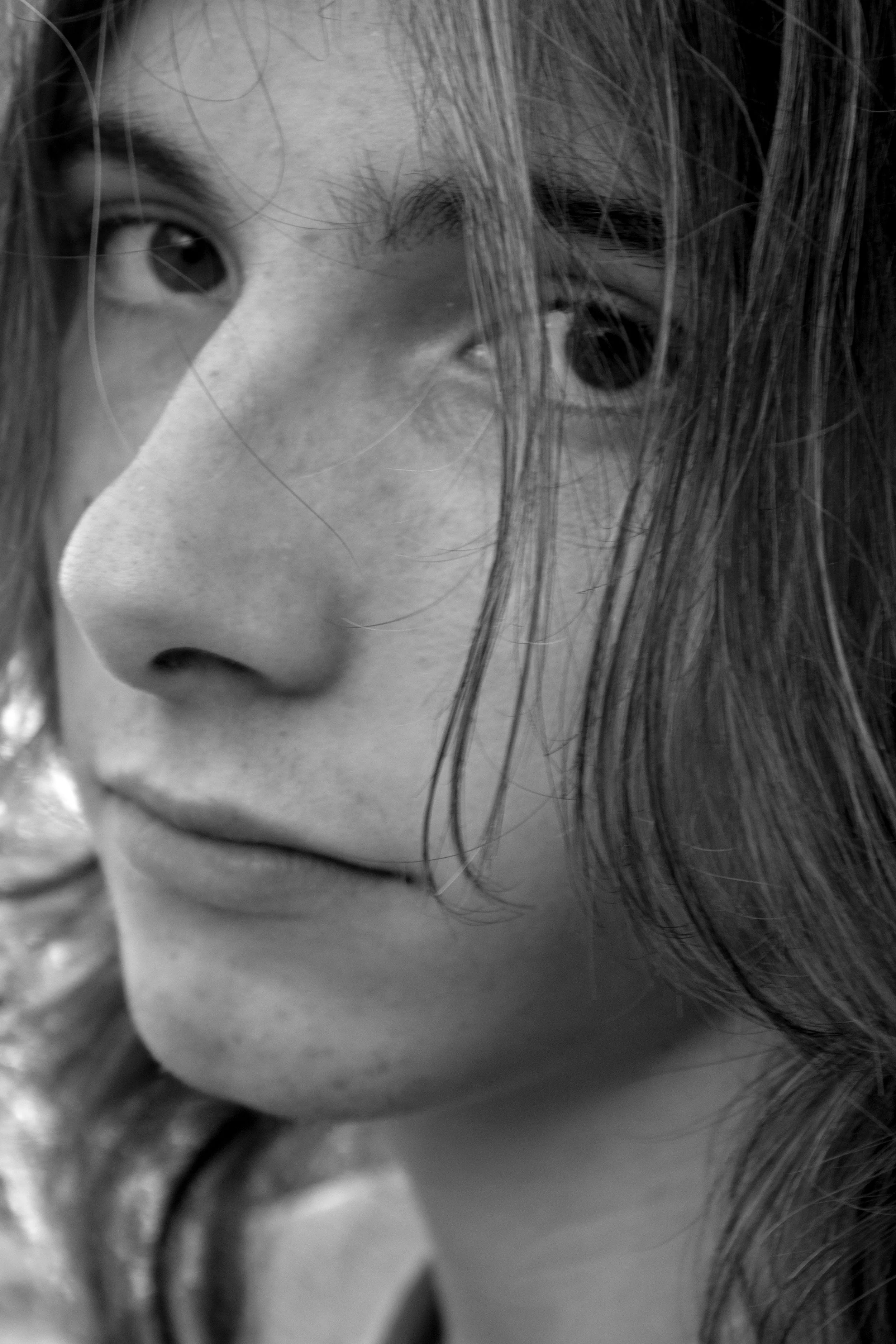 This piece was created while I was experimenting with how close I could zoom while still creating a pleasing composition. Once I had the photo I first edited it in color before deciding it was better in black and white. For this piece it was very important to get the black and white correct to bring out all the detail on his face. This photo comes out of artistic experimentation, allowing the photographic process to be fun and free. The image was just taking while waiting at the bus stop on our way to his house and to me it shows how having fun with your camera can yield great results.