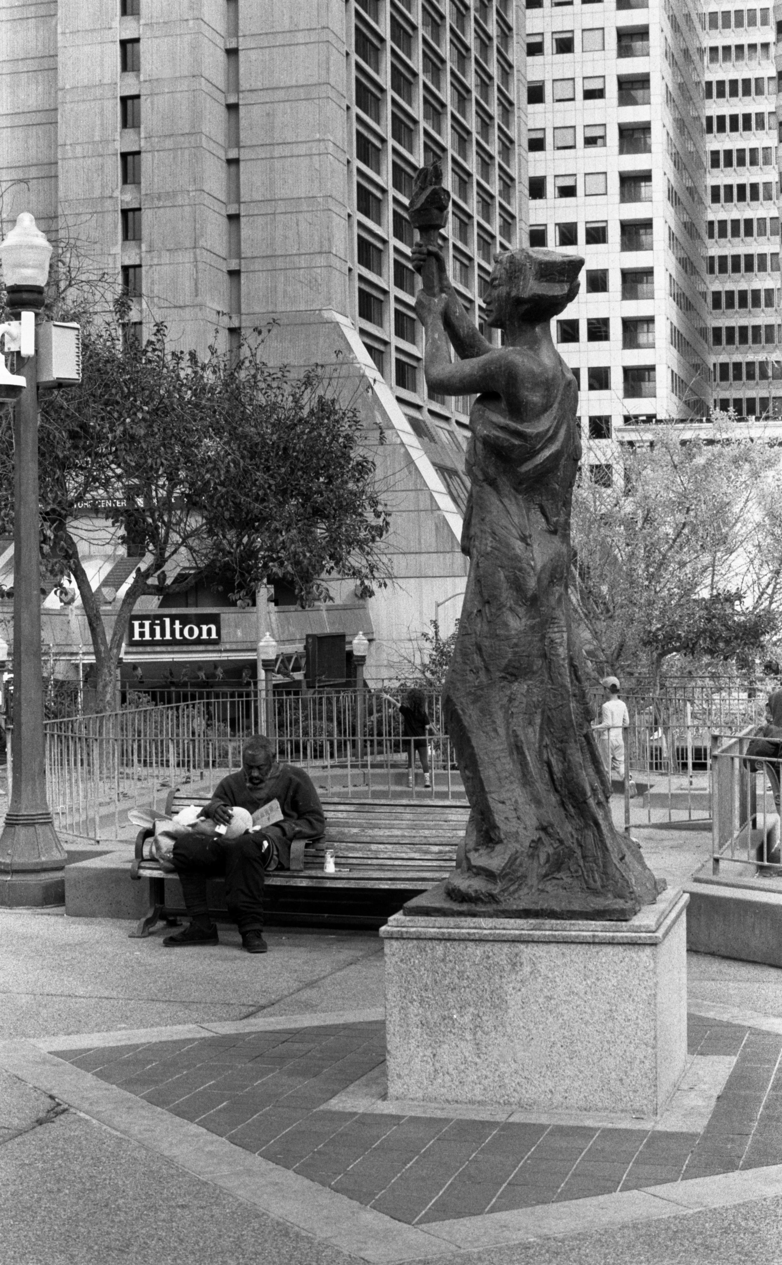 With this piece I wanted to to juxtapose the statue that represents hope and freedom with the homeless man sitting on the bench.
