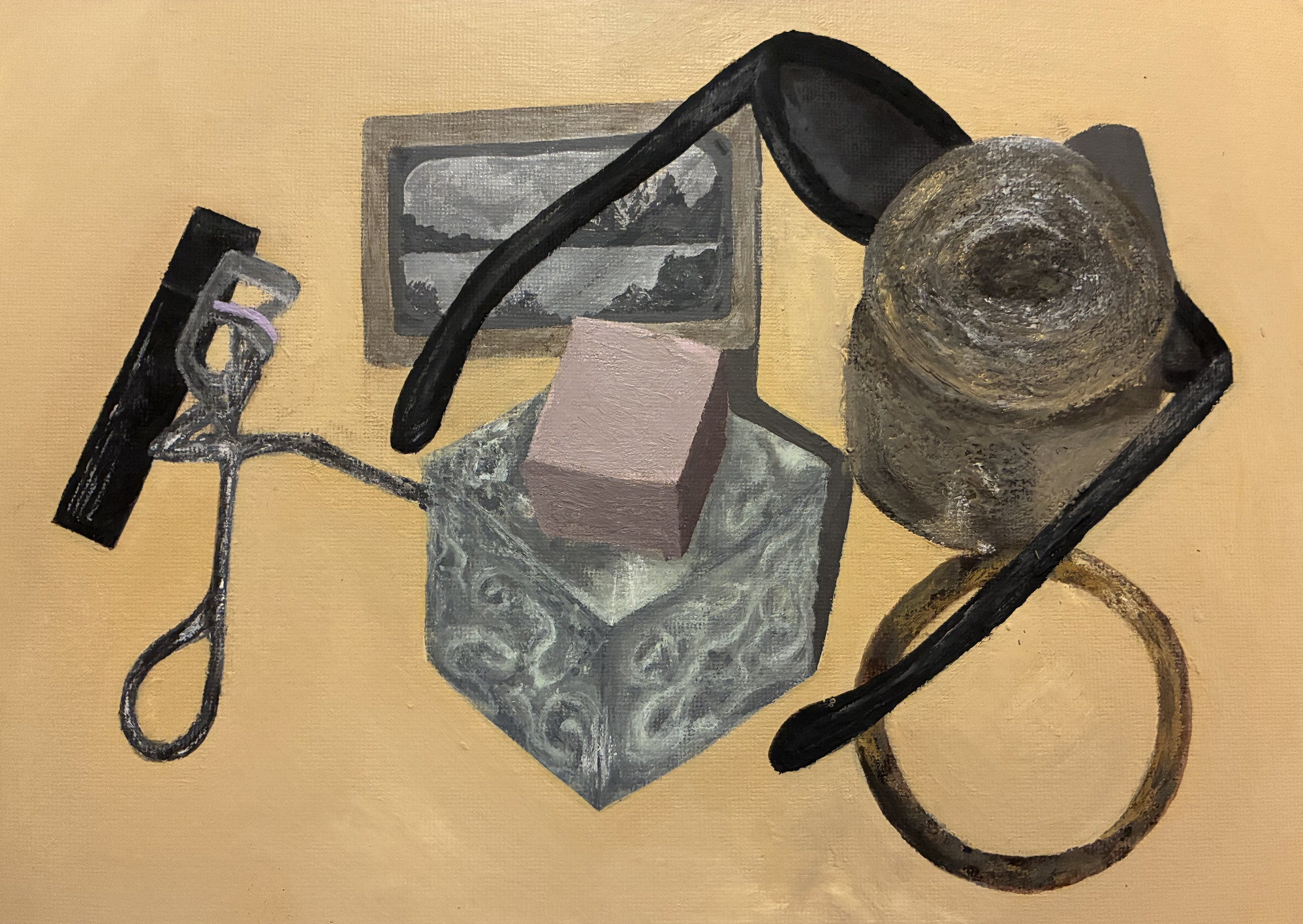 My piece reflects the nostalgic feelings one faces on the last day of summer before Senior year of high school. The still life depicts a pile of clutter that I felt was reflective of this stage of my life. The use of dull colors and a stagnant composition reflect the angst many feel about growing up.
