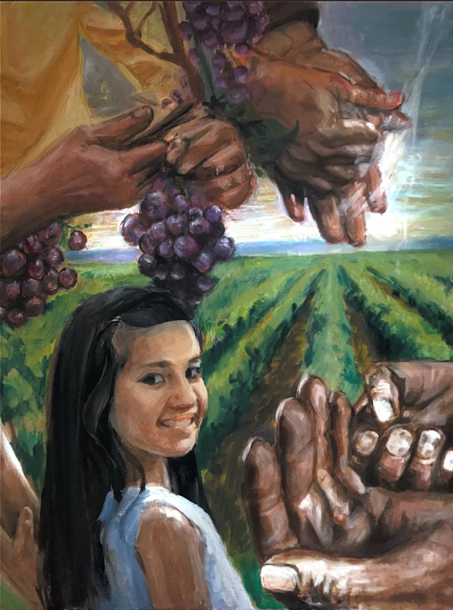 While creating this art piece, I didn't have a set idea of what my finished work was going to be. I knew I wanted my work to be focused on unseen workers in my community. My art piece was created in the span of 5 weeks, and each time I sat down to paint I added parts of what I noticed in my community to the work. My artwork primarily focuses on the hands of the laborer's in the vineyards. By weaving a core part of their identity along with the medium of oil paint, I can efficiently illustrate the rough reality of what we see as prized. There is a lot of laborious work that goes into making wine, and we hardly notice it. Therefore, I decided to create a piece on unseen workers.