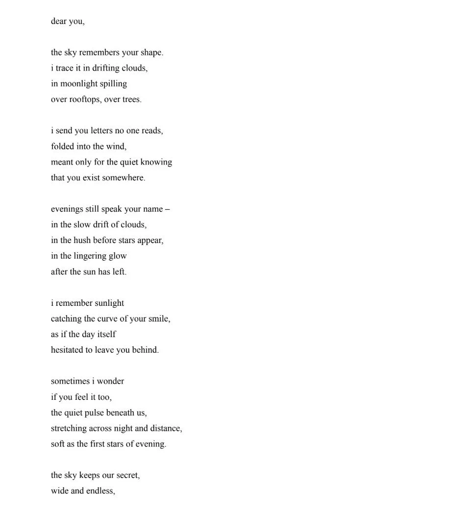 Letters written to the sky reflects the quiet yearning for someone we are no longer together with. using the sky (clouds, moonlight, stars) as a metaphor for distance and lingering connection, I focused on short, lyrical lines and layered imagery to convey romantic longing. The poem captures love still felt, even as our paths diverge.