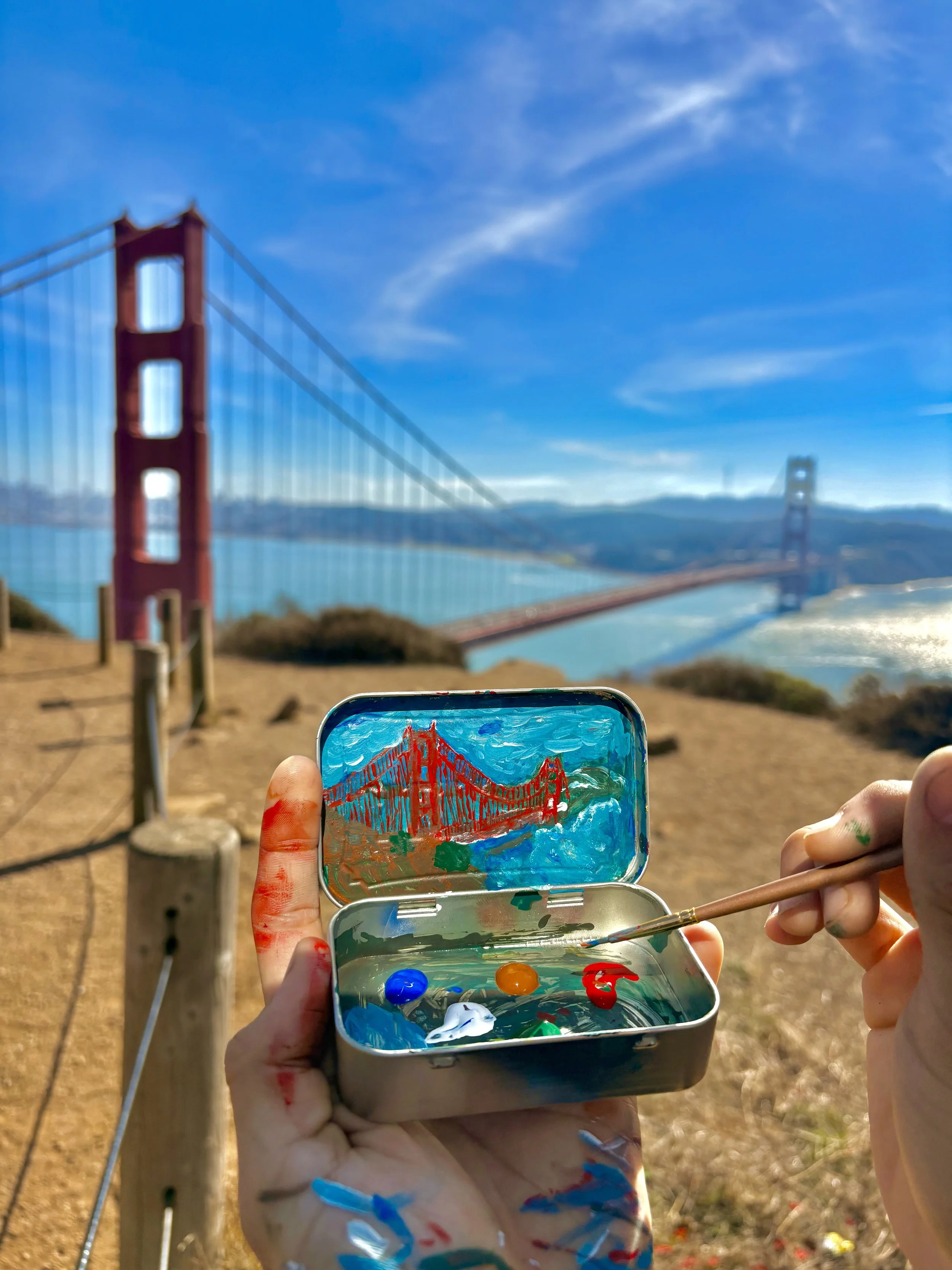 Altoids tin, paintbrush, paint, golden gate bridge