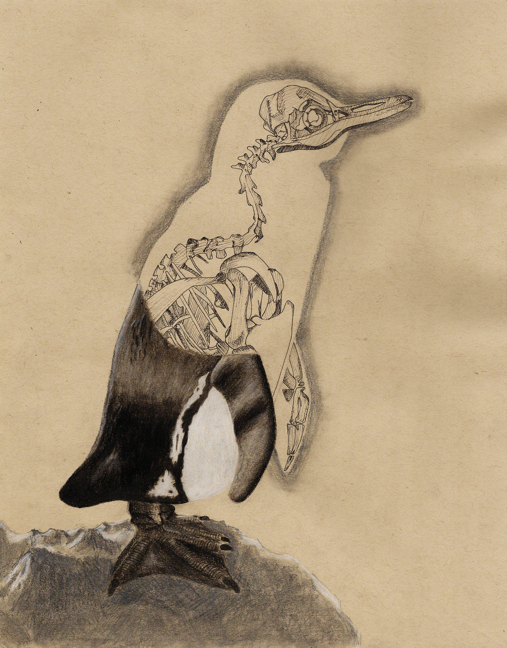 This piece is about the endangered Galapagos Penguin, depicting the top half as a skeleton looking out into the distance, longing for the other penguins in its colony. This emphasizes the importance of protecting species at risk of endangerment as well as bringing attention to the impact of climate change and human actions.