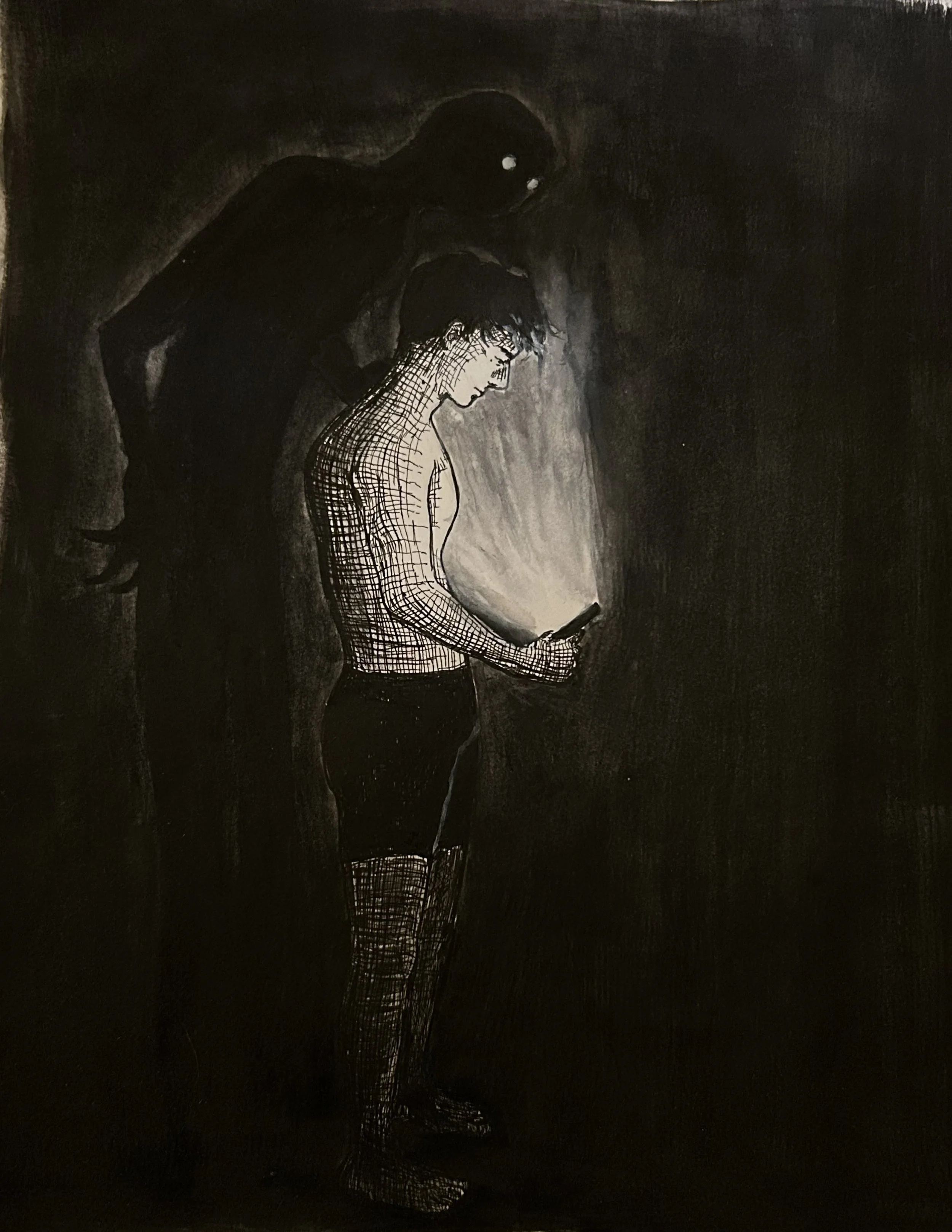 I created this piece in reflection of my bad personal habits with procrastination and overconsumption of media. The figure in the background is meant to represent a looming feeling of uneasiness, loneliness, or danger.