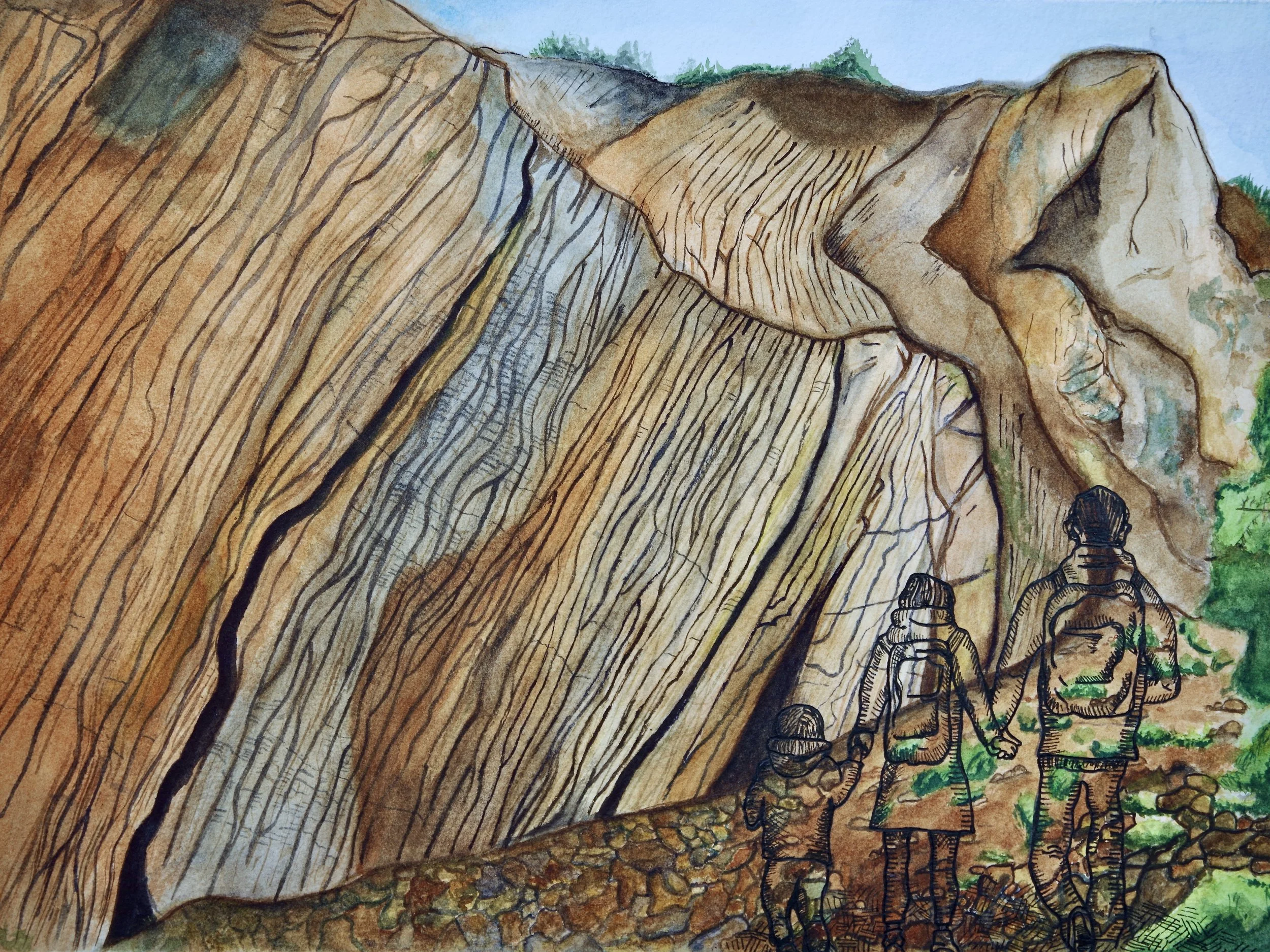 My painting is of rock called chert that forms in layers of plankton skeletons compressed under the ocean’s pressure, but the metaphor I chose for my painting is talus. Talus are fragments of rock broken down from an outcrop, which is exposed bedrock that is part of the solid foundation underneath everything. Talus accumulates at the bottom of the outcrop it broke away from. I chose talus because I can compare the way talus is formed to my family and the events in our history that made them migrate to a new country. For the ink on my painting I chose an image of a family of three walking forward. It's meant to illustrate the people leaving their home country, pulled to find better opportunities. I chose this picture because it represents my dad’s journey with my grandparents and how they first arrived in this country seeking a better life.