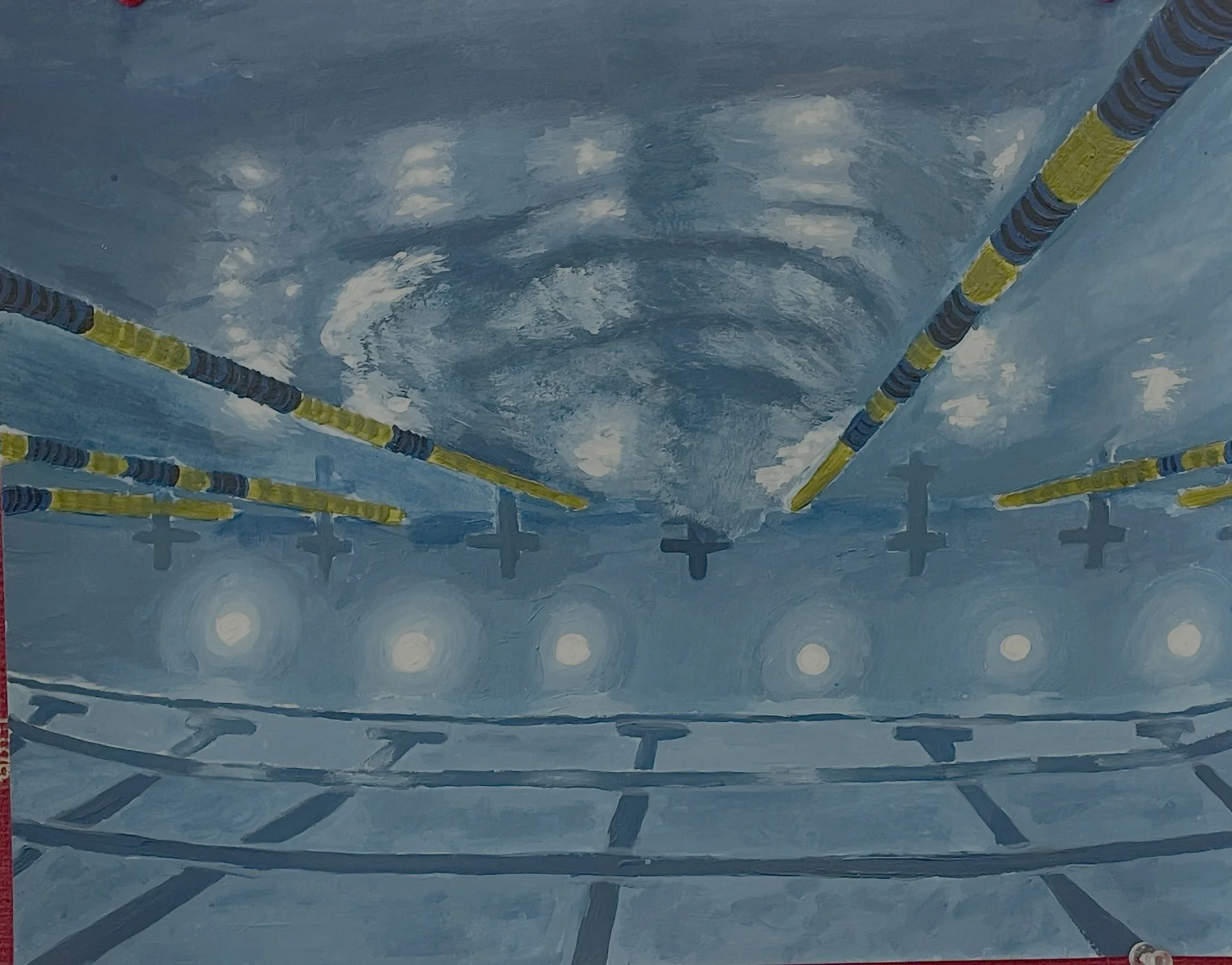 I took a photo using a GoPro underwater of the pool I practice at every day, and then I started off by underpainting, mixing acrylic paint with water to get the base colors down and then I went over with just acrylic paint to get the reflection aspect.