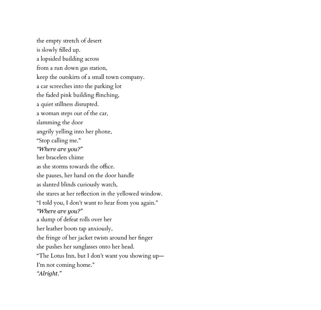 I chose to submit poetry because it is the strongest format that I write in. I enjoyed writing this piece and I picked it for my submission because it focused on a somewhat different theme and setting than my writing usually does.