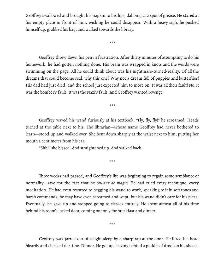 Loyal to the Last is a 100-page novel following a boy named Geoffrey trying to navigate life in the wake of his dad's death. Set at The School for Extraordinary and Unusual Talent in the early 1940s, Loyal to the Last seamlessly blends real world history with fictional elements of magic and monsters. My submission is segment of the larger novel. I made Loyal to the Last over the course of one year, juggling my this project with my school work and my ongoing theater productions. I took inspiration from some of my favorite books that I read as a kid, but put a lot of effort into my own research and making the story fun, original, and true to myself. As this is my first real piece of writing, I had a mentor to help me with the brainstorming and editing phases.