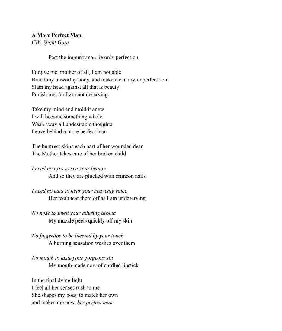 Make Me As Perfect As The Glowing Sun is a collection of three poems, which all share the theme of rebirth. Each poem also uses light, or the absence of it, to represent something more abstract. A More Perfect Man presents a call to a creator to change yourself willingly, exploring the idea of changing into something unrecognizable, and ends in total darkness. Thy Holy Warrior presents a situation of fighting a demon inside yourself in a grand and biblical sense, exploring the idea of true hopefulness in the face of despair, and ends in heaven’s light. Ode: The Firefly is written for a firefly whose light is now fading, exploring the idea of losing your youth, becoming a new person in death, and shows how light and darkness are both necessary. All three poems are dear to my heart, and have helped me grow as an author.