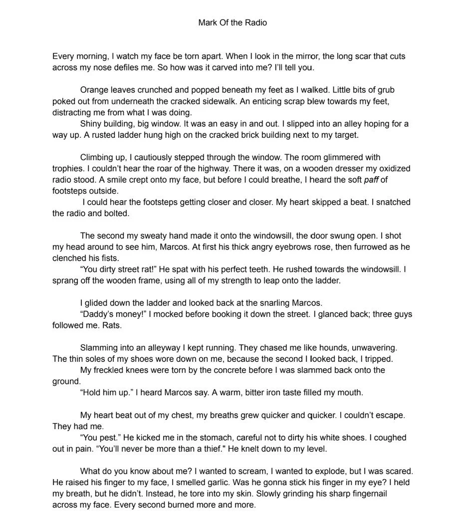 Mark Of the Radio Creative Writing Feb 3 Written By Tools BACF Lilah M. Artist Statement The story of a scar. Creative Statement Creativity means expression, it means sharing feelings, or experiences. It means to speak and to be heard by those who wish to hear you. Tools BACF