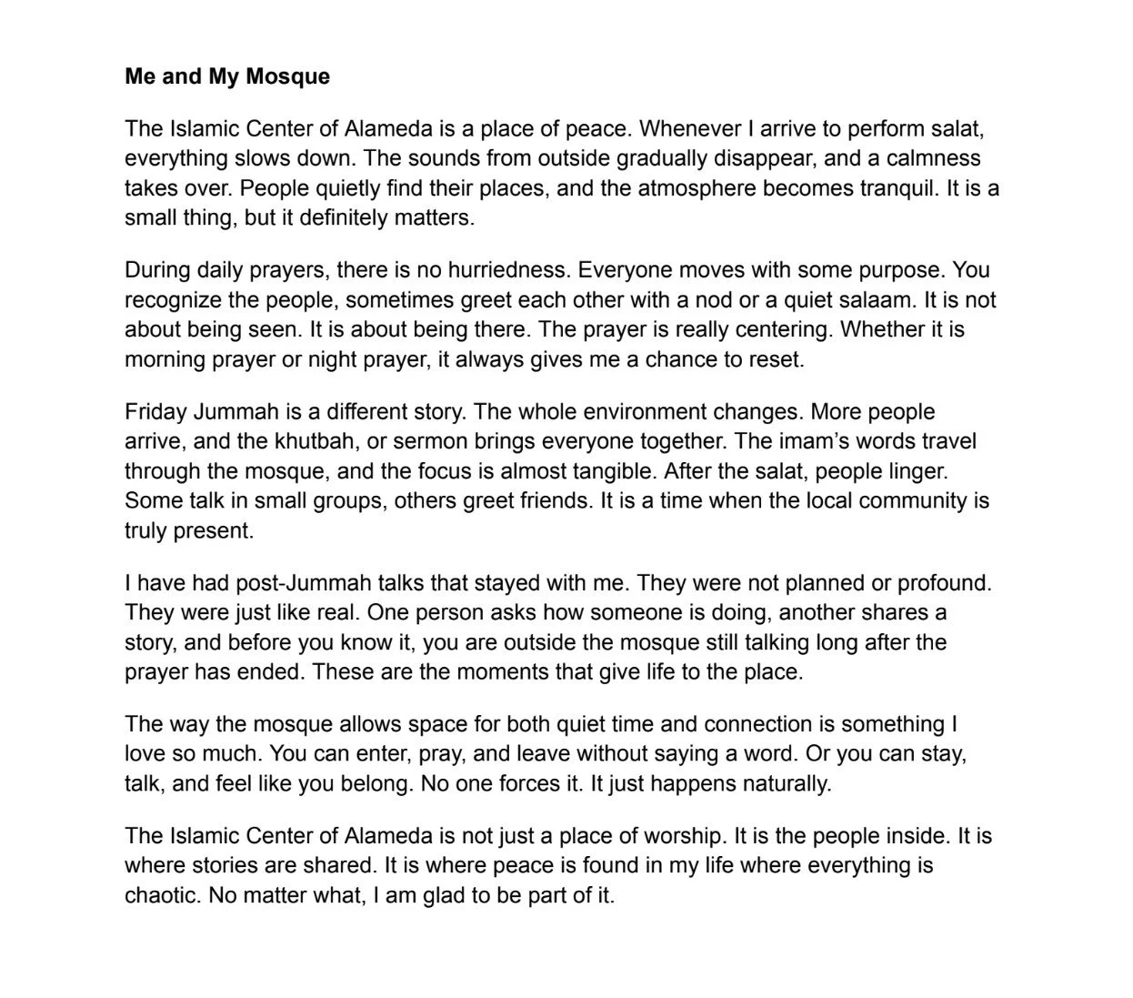 This piece is about me and the Islamic Center of Alameda, the mosque I’ve grown up with. It’s where I’ve prayed, learned, laughed, and felt part of something bigger. I wanted to write something real about how the mosque isn’t just a building, but a part of my life. While working on this, I thought about the little things that make it special, like the people, the environement, and the feeling of peace when I walk in.