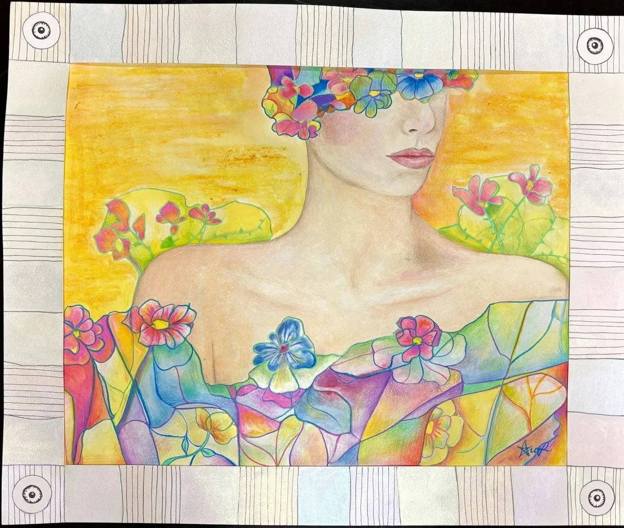 This piece is part of my sustained investigation for my AP Drawing class. I wanted to explore the media's idea of unattainable perfection and how it affects young girl's ideas of their own bodies. I began this piece with a wash of yellow watercolor across the whole paper, then filling in smaller spaces with specific colors. Next, I went in with colored pencils and added gradation and detail to every smaller section that I created in the watercolor stage. I wanted the flowers to appear vibrant and enticing to represent the joy that perfection must feel like and the yearn to have it. For the border, I made squares with opalescent watercolors and then drew on eyes and lines with a fine-line pen. I had to make many revisions to this piece throughout my process but I am very happy with the way it turned out.
