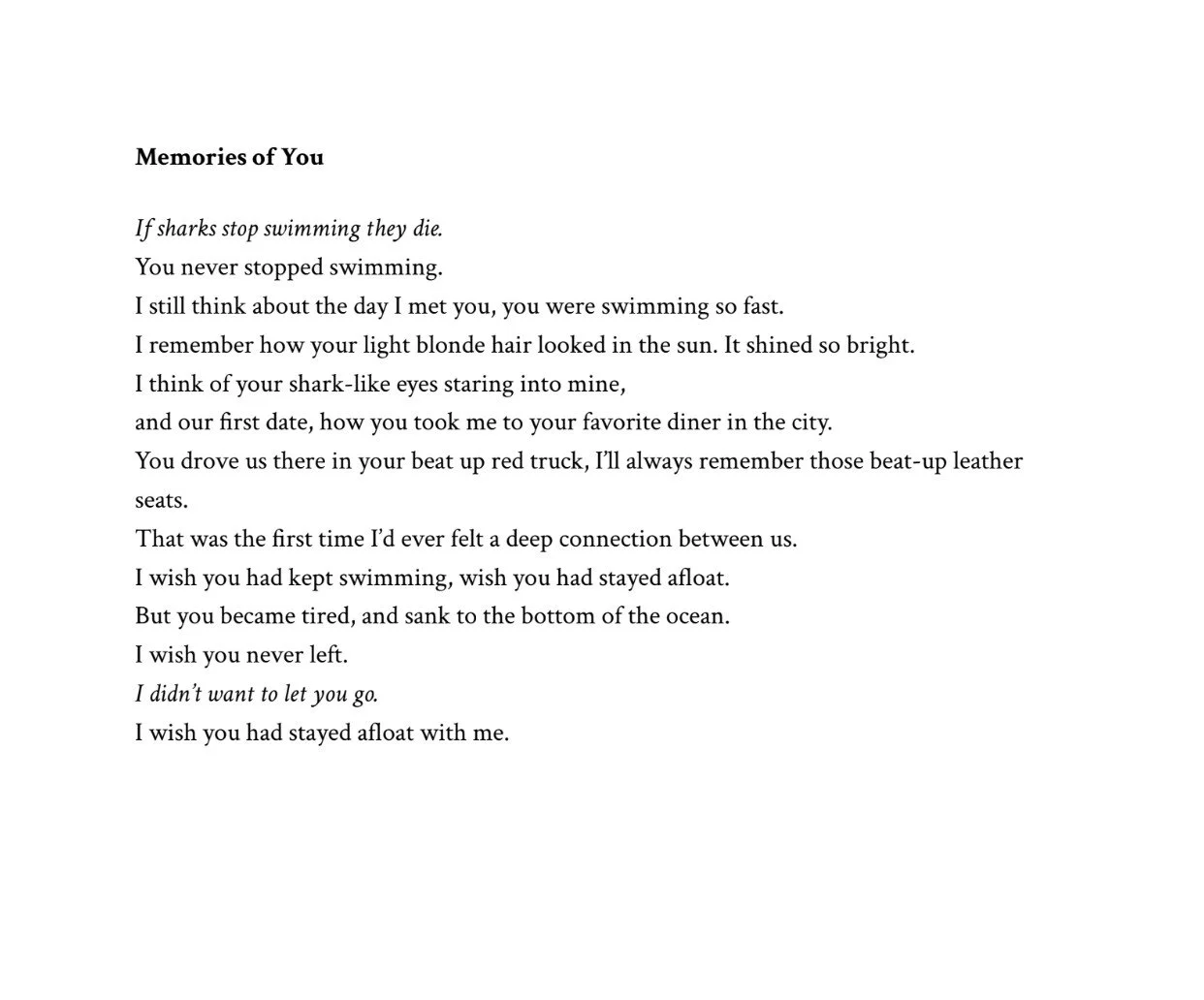 The story I have written is about losing someone who is close to you. When I wrote this piece, I tapped into my personal feelings about losing someone close to you. This piece was inspired by the passing of my close friend, who always loved to go on wonderful journeys.