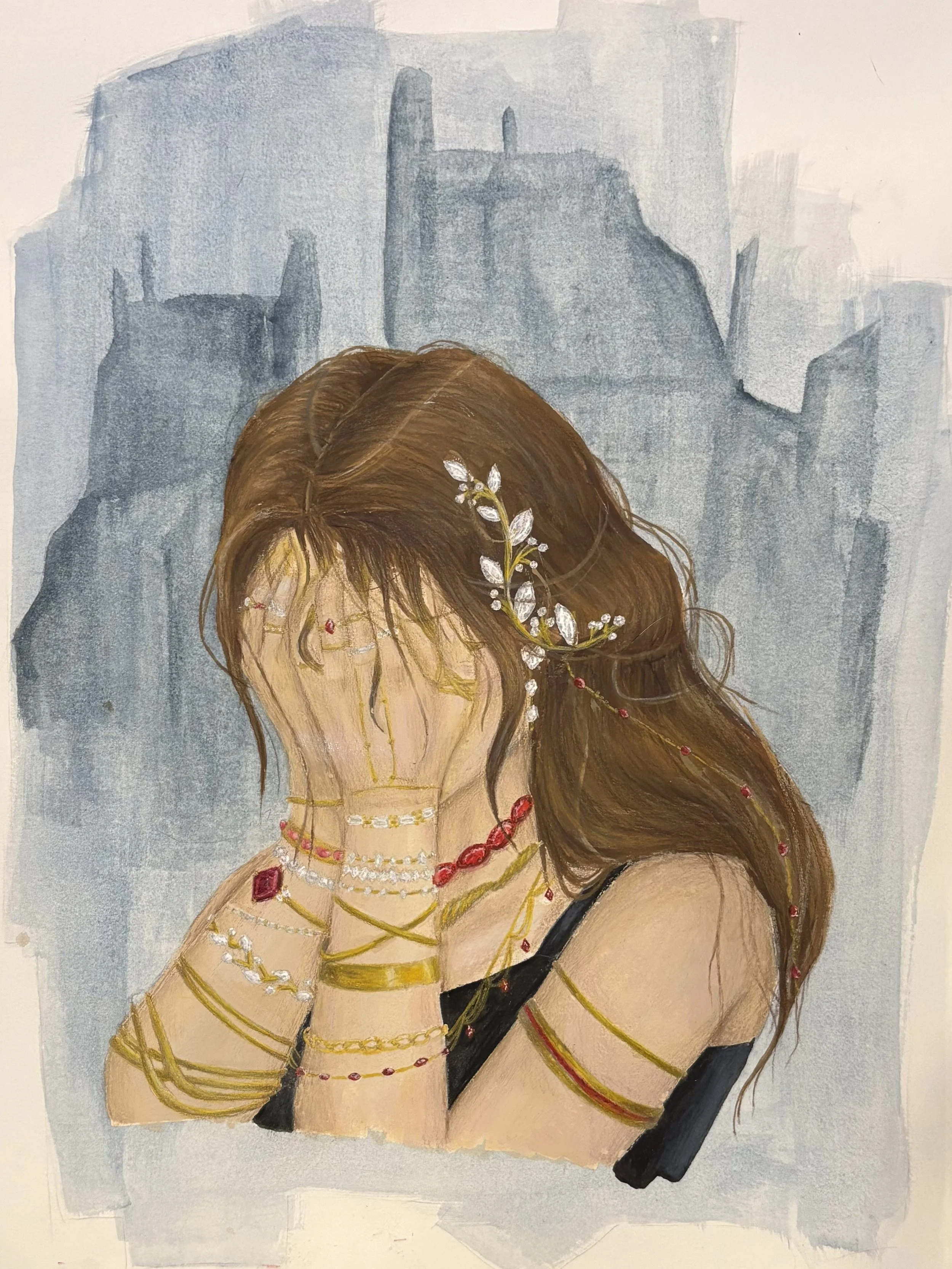 This piece explores the how one cannot buy happiness. While many argue that you will lead a better and therefore happier life if you have money, I think that even a comfortable or luxurious life simply can’t fix every problem. If we try to fill an empty space inside ourselves with the wrong thing, it only gets bigger. I wanted to explore the idea that in the end, diamonds and gold will only weigh you down. This piece draws inspiration from the legend of king Midas, a king who had the power to turn everything he touched to gold. He eventually learns that this power is a curse, and that true happiness does not come from possessions.