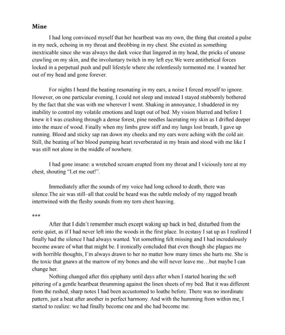 A short story about someone struggling with self alienation and learning to grapple with self acceptance. It is written to show the futility of contentment and the duality of identity, hating yourself but being unable to escape who you are or who you have become. I wrote this to show the reader and the character that despite this everlasting existential crisis, don’t surrender to the rejection of self, letting something you don’t want consume you but rather, grasp the ability to make it better and make a change.