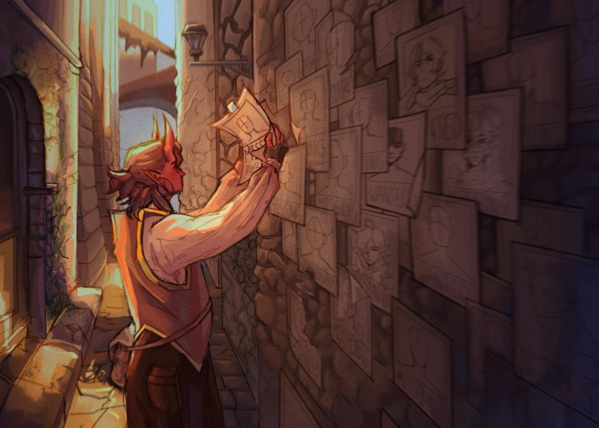 Through and through, I've met and lost many people throughout my life- both in family and friends. The amalgamation of these experiences resulted in me creating a character who has encountered similar companions, keeping few yet losing many. Putting up the missing posters is an acknowledgement of those whose presence was now lost from his life, an acknowledgement of any conflicts that went unresolved, an acknowledgement that he wished he could have done better when he had the chance. The wall represents all my past faults, all the mistakes I long to mend but will never be able to. The warmth of the piece contrasts that of the darkness of it; despite all I’ve lost, these experiences will serve as a learning experience for me- as a reminder to never take what I have for granted and to appreciate those in my life while they’re still with me.