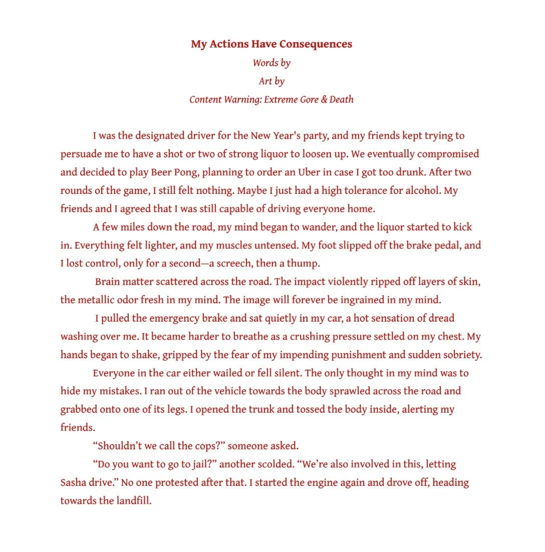 This artwork was inspired by a dream I had about my sister dying in a bus crash. I wanted to use this piece to empathize that feeling of despair and guilt.