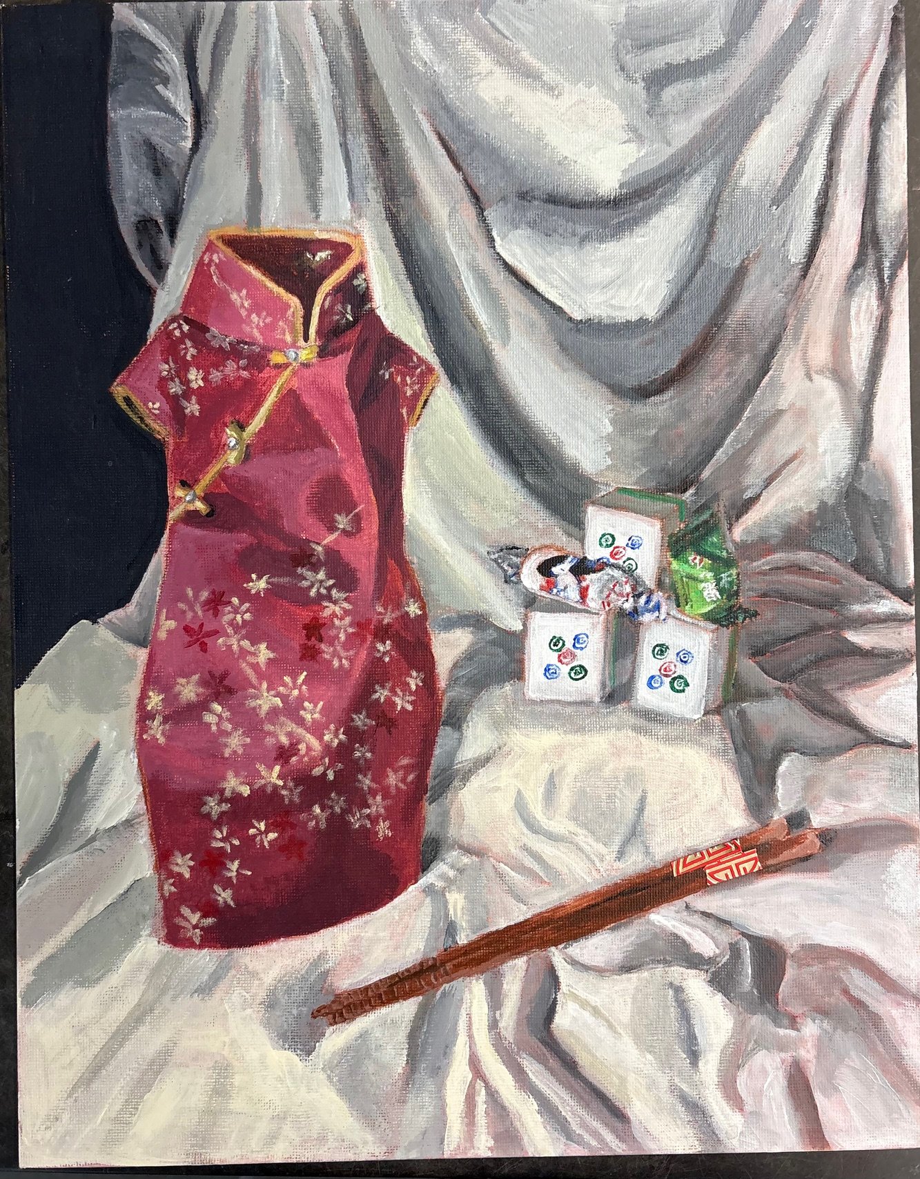 As an American-born Chinese, there were times that I felt distant from my cultural community. Still, the traditions are what kept me connected and feeling a sense of belonging with my heritage. Beside the traditional dress worn during New Year, I painted chopsticks with real red envelopes pasted on, representing family meals and red envelope exchanges. On top of the mahjong tiles are common Chinese candies. Candy is often put out for prosperity during the New Year. Mahjong tiles are a symbol of togetherness as people spend hours playing with friends/family. I used saturated colors to convey the liveliness of celebrations and complementary colors (red or green) in each object and triangular composition to create a sense of unity.
