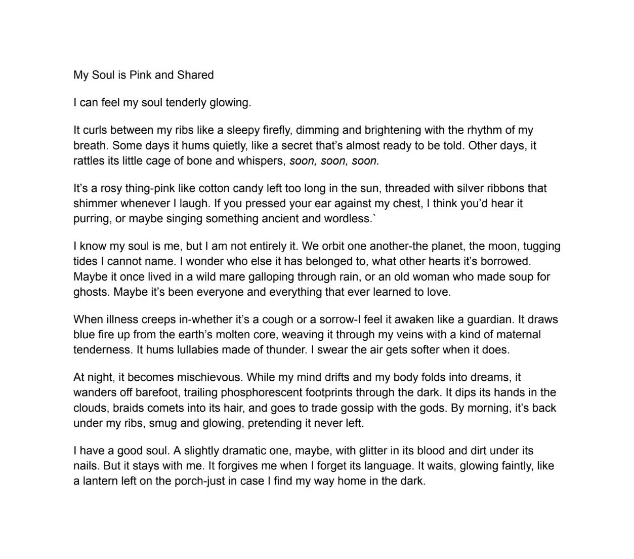 This prose originated from a Meditation I do every night in which I imagine my energy reaching down to the earth and up to the sky to ground myself and eventually I found myself doing that whenever I felt anxious or unsure. I've come to think of my energy that I imagine as my soul, Its a glowing pink blob thats sits in my chest.