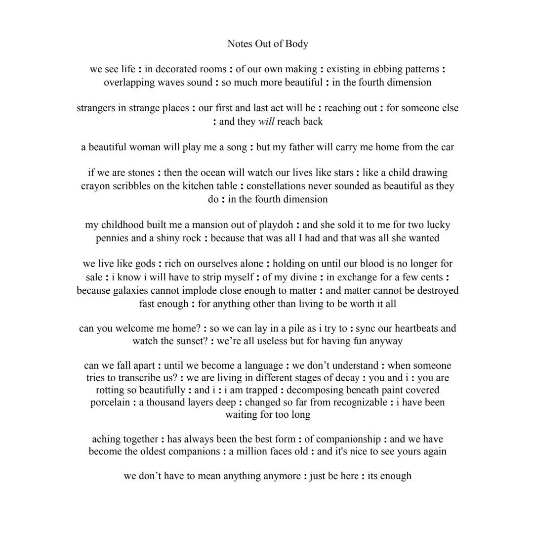 Notes Out of Body Creative Writing Feb 4 Written By Tools BACF Chloe S. Artist Statement This work was written in response to the Museum of Modern Art exhibit of "The Visitors." Creative Statement Creativity means attempts to bridge the gap between what is real and here and what could be real but is not yet. Tools BACF