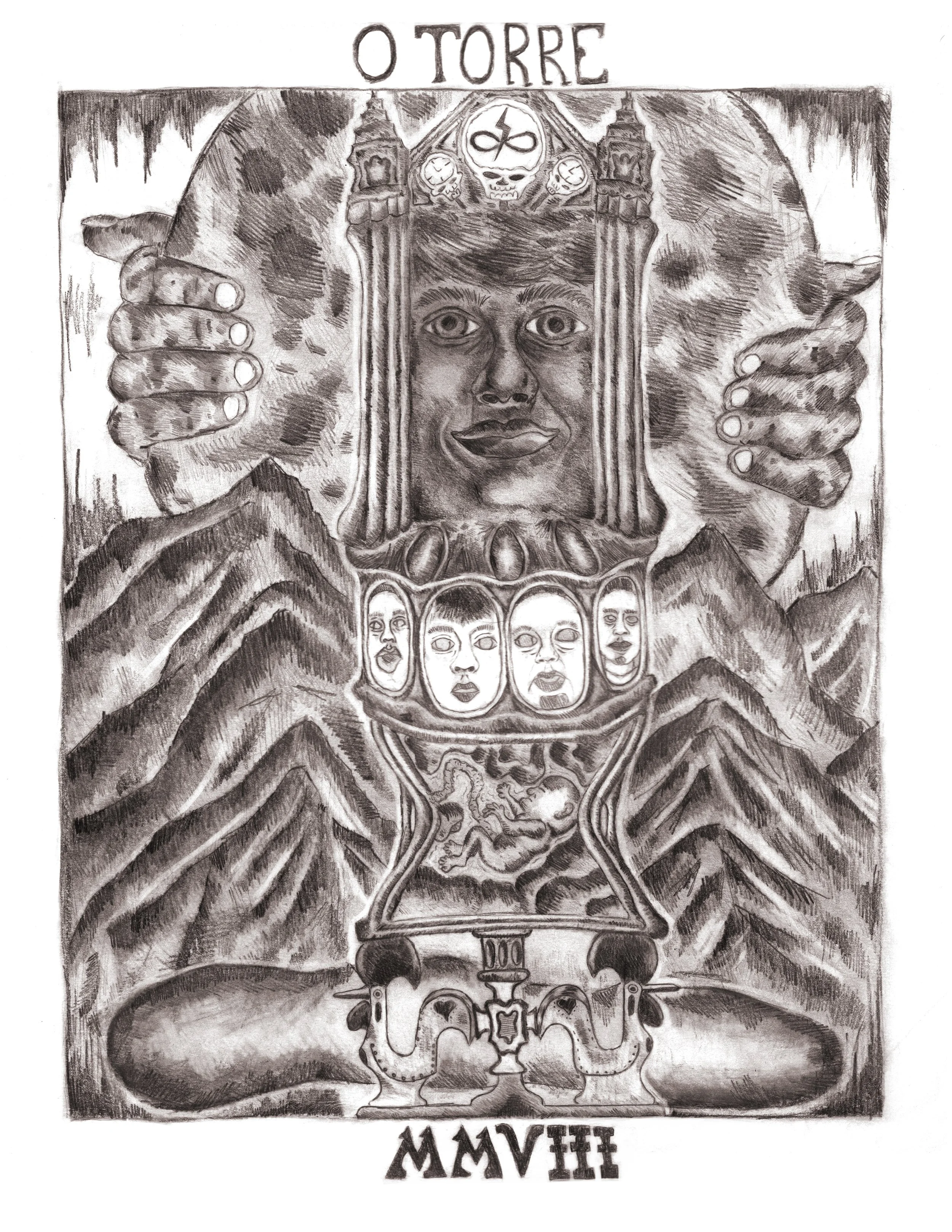 This personal piece, created for my AP Art Portfolio class, was inspired by the tarot card, The Tower. The card represents personal transformation growth, and rebirth, which often emerge during times of challenge or upheaval. At first, I connected to the card playfully because of my height (6'4"), imagining myself as the tower it depicts. As I developed the piece, using my favorite art medium, pencil, it became a deeper reflection of my identity and heritage, with my Portuguese roots symbolized by the roosters, like the ones displayed at my avo's house when I was growing up. Now, as I prepare to move on from high school and into greater independence, O Torre, holds new meaning for me. It mirrors the uncertainty and excitement of this transition, reminding me that from struggle or change comes growth. In my work, I see myself full of energy, possibility, and growth.
