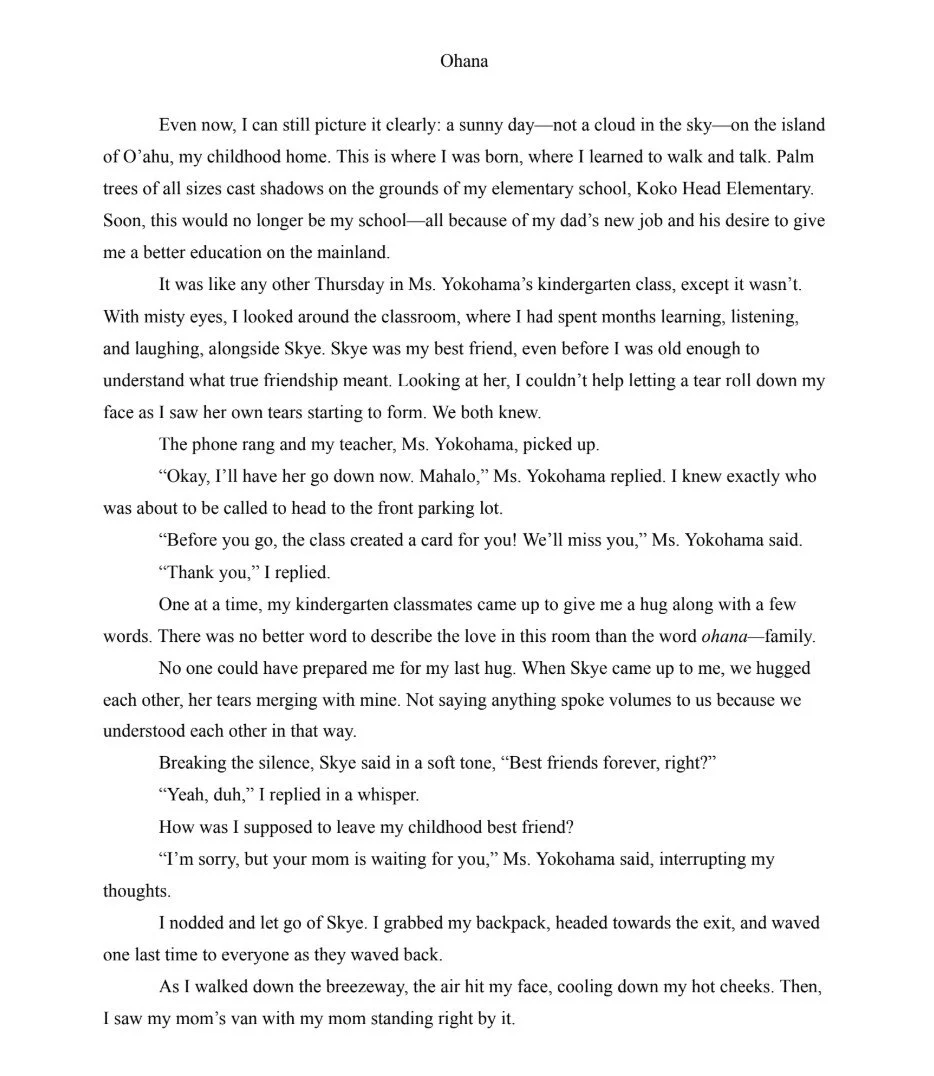 This piece of creative, nonfiction writing expresses the emotional toll leaving my home in Hawaii took on me as a six-year-old child. It captures scenes and memories from my final day on the islands—moments that have stayed with me all of these years. It also shows how that moment laid the foundation for my future—how I learned that even though I was leaving Hawaii, the culture and love I grew up with there would always be a part of me. That spirit of ohana continues to shape who I am today. It is something I’m grateful for and proud of as I continue my journey in life.