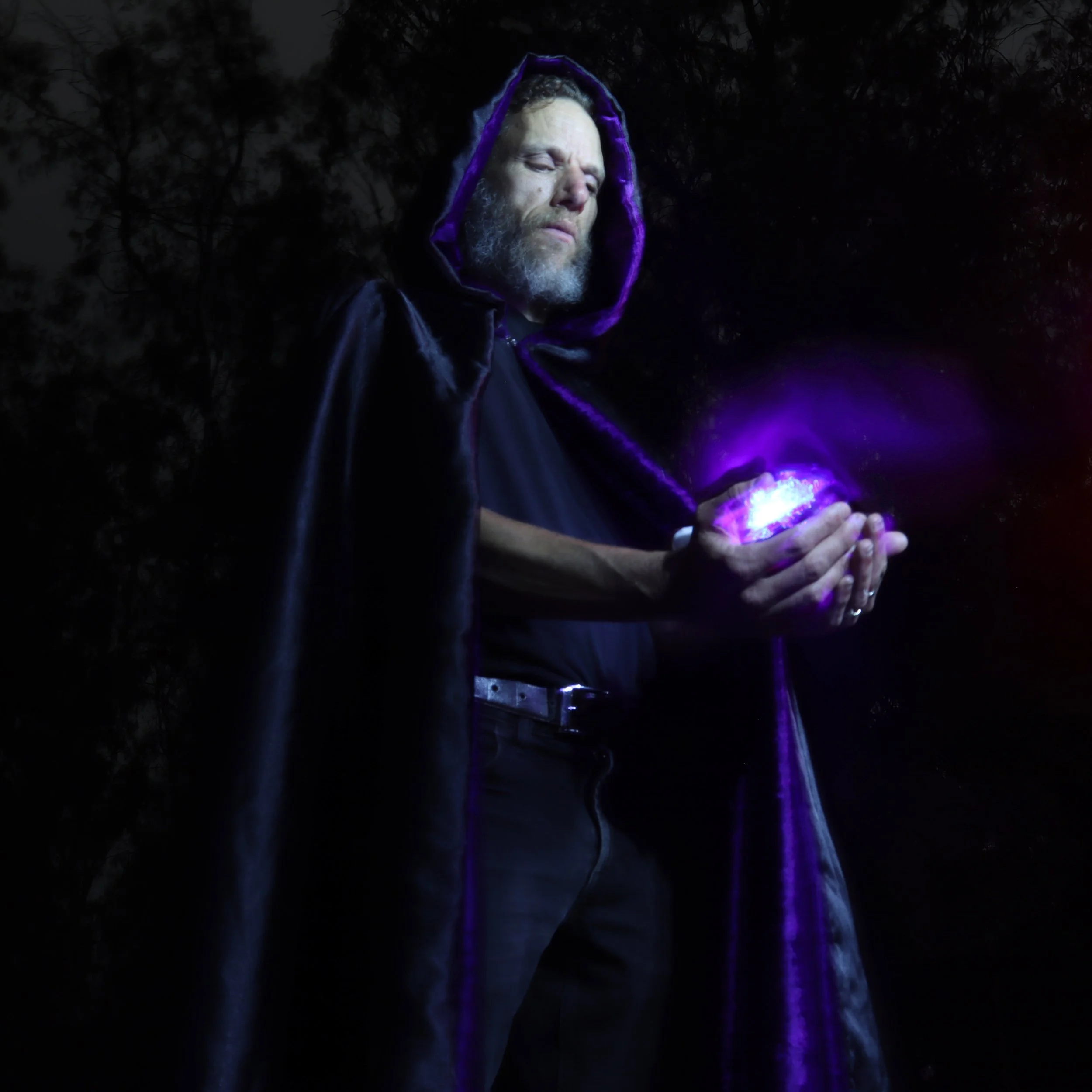 I took a long exposure photograph of my dad holding a spherical vase with purple fairy lights inside it. He was wearing a cloak also, and I illuminated him with a flashlight from out of frame.