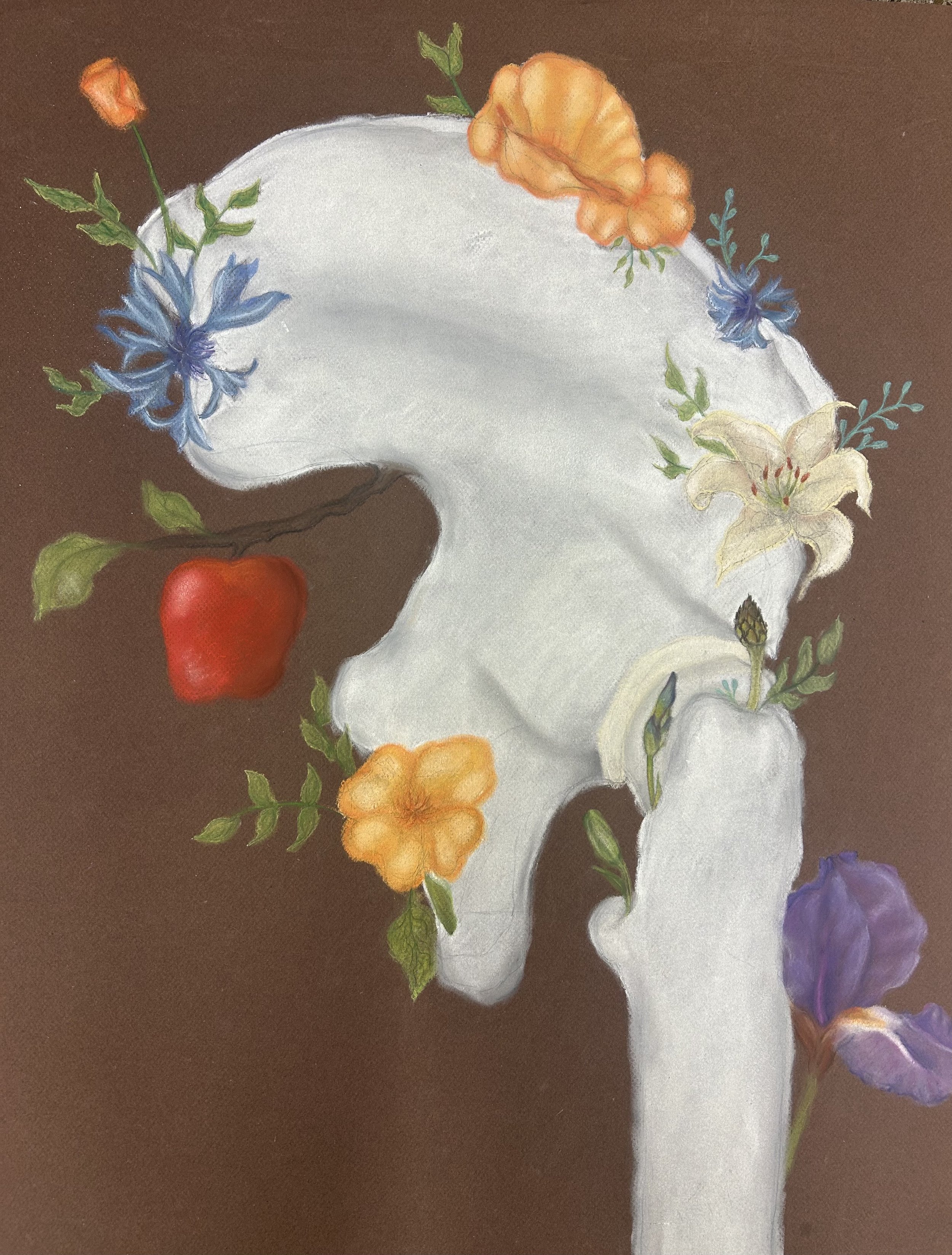 I wanted to represent the places I call home as well as my ethnic origins, but also include what has been a constant theme in my art this year, which has been bones. Three of the flowers are the national flowers of my ethnic origins, Germany, Croatia, and Italy; while the apple and poppy represent Washington and California.