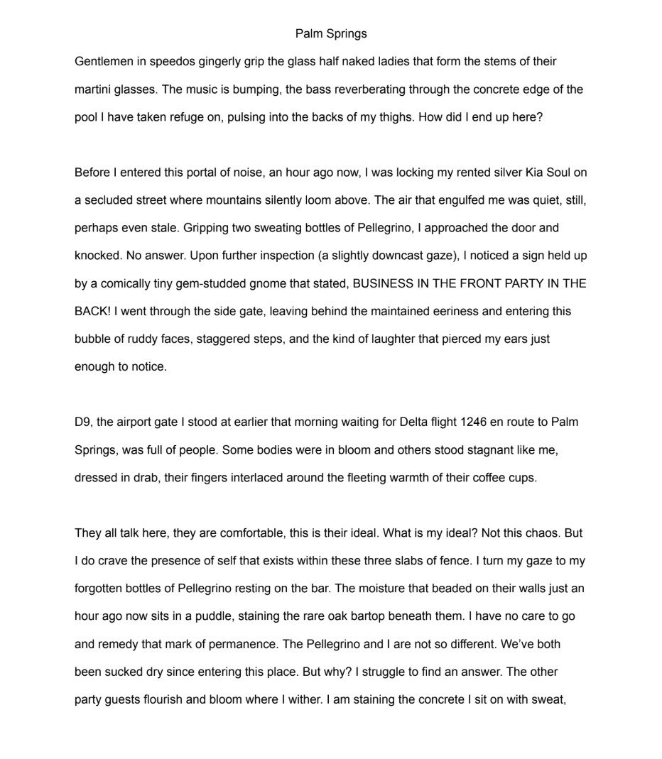 This piece of micro-fiction was inspired by a trip I took to Palm Springs. It is meant to be a fun read that also touches on belonging and the journey to find a sense of self. It follows a revelation that quietly ruminates from overwhelming self-expression hidden behind an eerily perfect gated community in the artificial oasis that is Palm Springs.