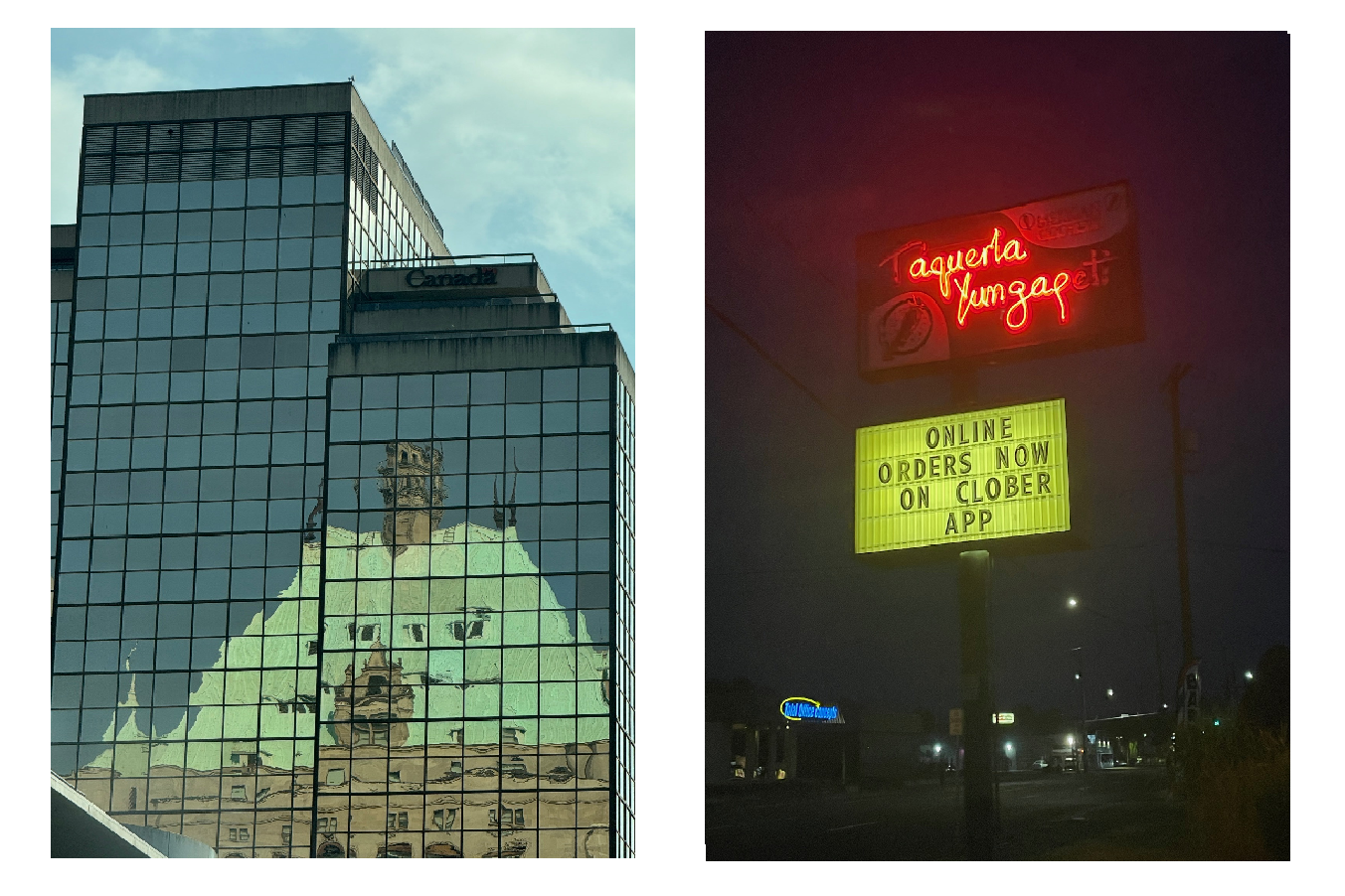 Oftentimes, when I think about history, I find myself assuming that the events of the past are divorced from the present, confined to my heavy textbooks. I challenged myself to overcome this assumption and see how the past and present truly relate to each other. In this case, I took these two photos. The photo on the left illustrates how the present (a modern building) reflects the past (an older building). The photo on the right shows how the past (an old sign with neon-lighting) adapts to the new (by advertising their presence on a delivery app)