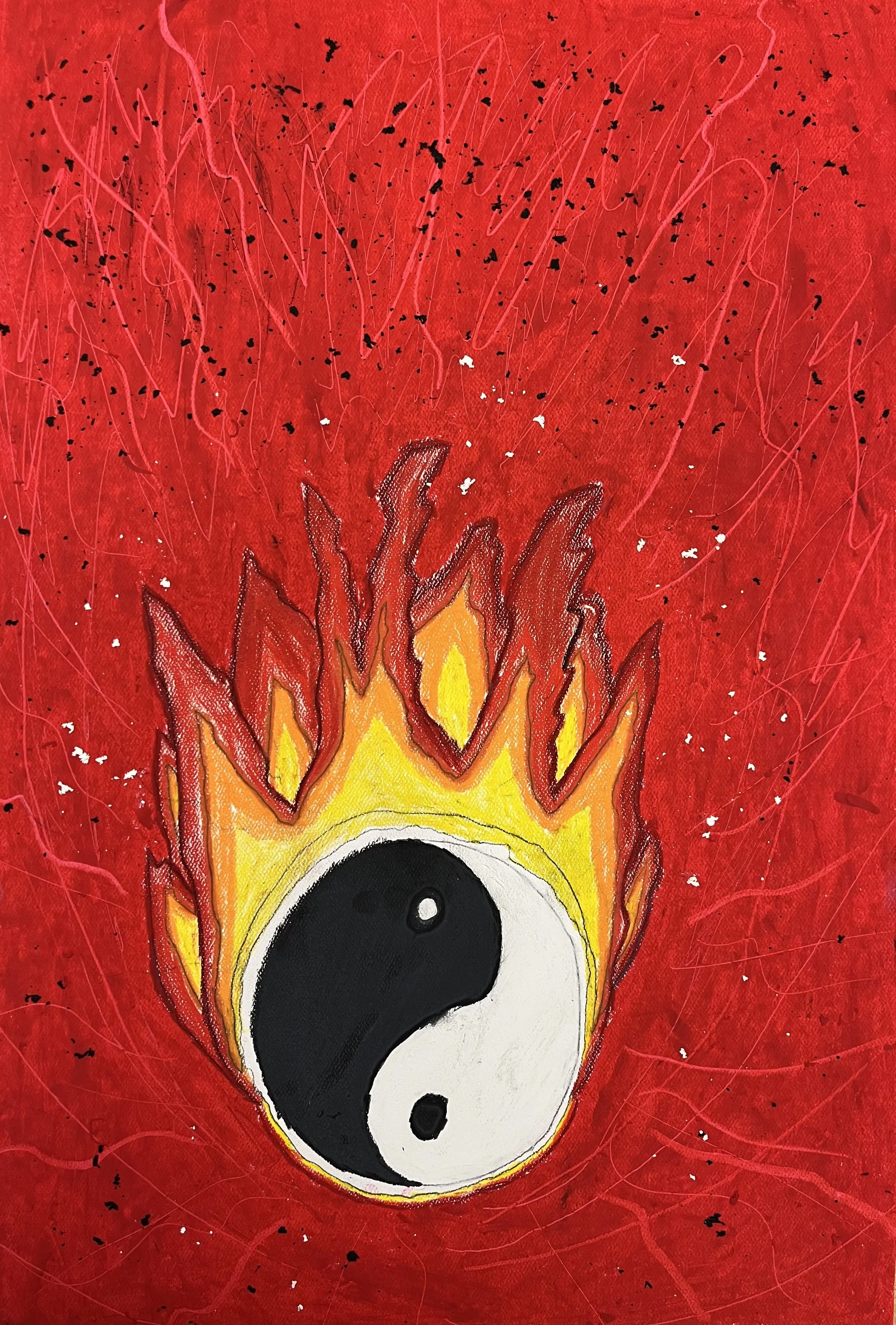 I started by making the circle for yin and yang, continued from there making the fire, then did the background. I had to end it with flakes of oil pastel.